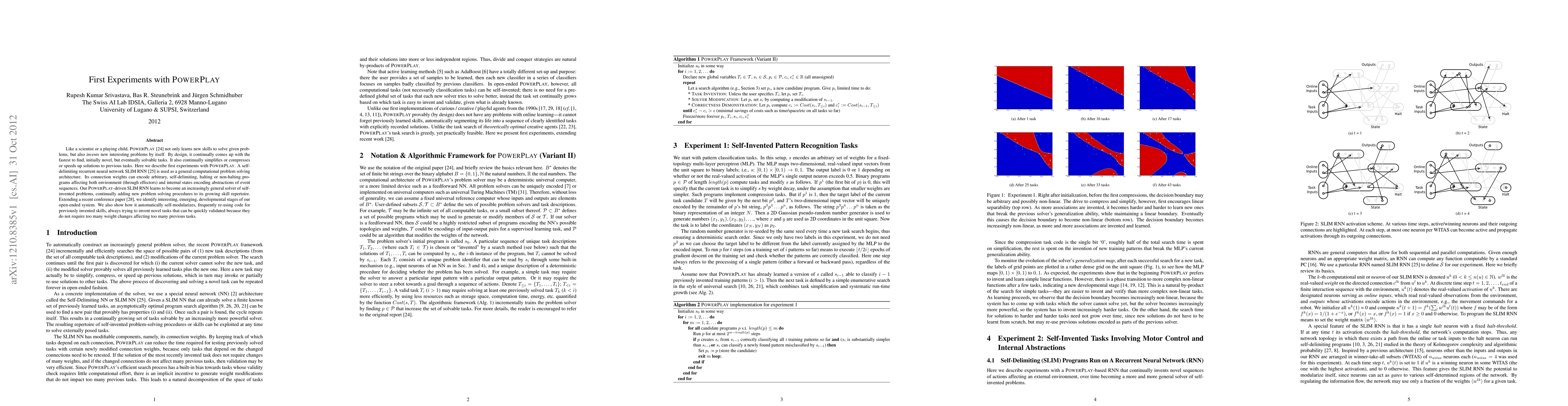 This paper introduces PowerPlay, a self-delimiting recurrent neural network (SLIM RNN) that learns to solve self-invented problems. PowerPlay continually generates novel tasks and refines solutions, automatically self-modularizing and reusing code from previous skills. It demonstrates developmental stages and the ability to quickly validate new tasks with minimal weight changes.