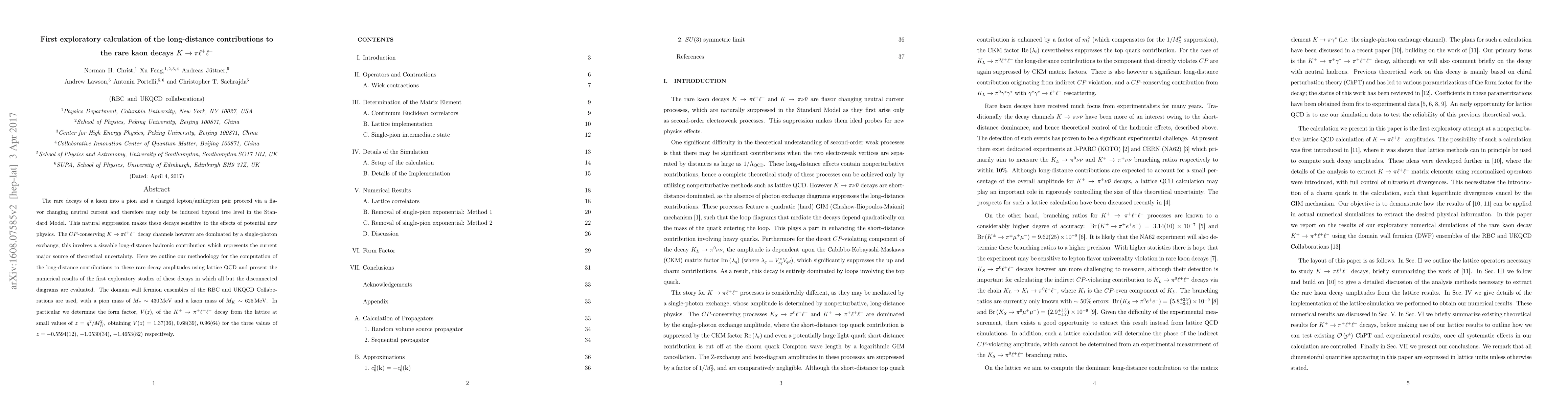 The rare decays of a kaon into a pion and a charged lepton/antilepton pair proceed via a flavour changing neutral current and therefore may only be induced beyond tree level in the Standard Model. This natural suppression makes these decays sensitive to the effects of potential New Physics. The CP conserving $K\to\pi \ell^+\ell^-$ decay channels however are dominated by a single photon exchange; this involves a sizeable long-distance hadronic contribution which represents the current major source of theoretical uncertainty. Here we outline our methodology for the computation of the long-distance contributions to these rare decay amplitudes using lattice QCD and present the numerical results of the first exploratory studies of these decays in which all but the disconnected diagrams are evaluated. The domain wall fermion ensembles of the RBC and UKQCD collaborations are used, with a pion mass of $M_{\pi}\sim 430\,\mathrm{MeV}$ and a kaon mass of $M_{K}\sim 625\,\mathrm{MeV}$. In particular we determine the form factor, $V(z)$, of the $K^+\to\pi^+\ell^+\ell^-$ decay from the lattice at small values of $z=q^2/M_{K}^{2}$, obtaining $V(z)=1.37(36),\, 0.68(39),\, 0.96(64)$ for the three values of $z=-0.5594(12),\, -1.0530(34),\, -1.4653(82)$ respectively.