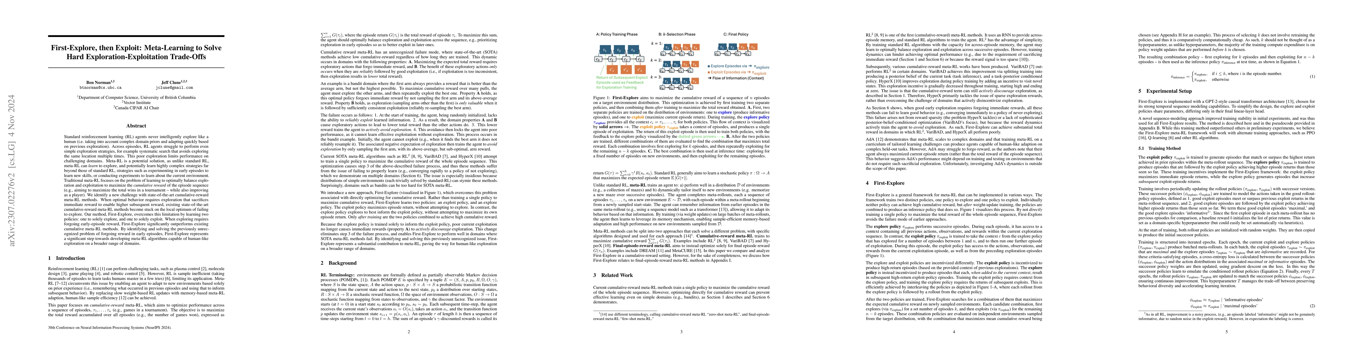 This paper proposes a meta-reinforcement learning (meta-RL) framework called First-Explore, which separates exploration and exploitation into distinct policies to enhance sample efficiency. The framework outperforms standard RL and meta-RL approaches in domains requiring intelligent exploration, demonstrating its potential to solve challenging exploration-heavy tasks.