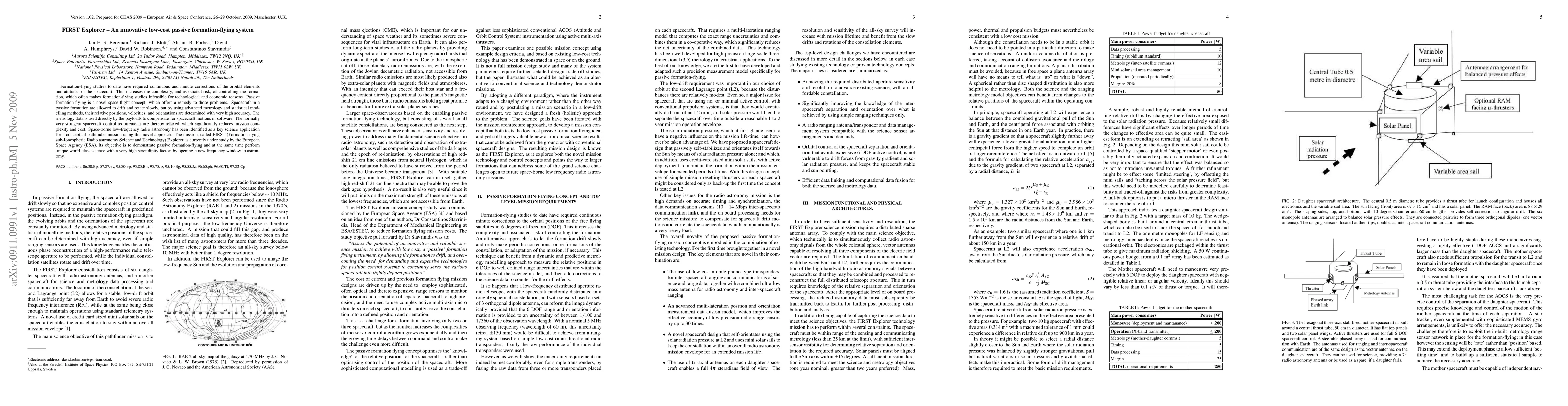 The FIRST Explorer mission proposes a low-cost, passive formation-flying system that reduces complexity and cost by allowing spacecraft to drift and rotate slowly while using advanced metrology to determine their relative positions with high accuracy. This approach aims to demonstrate passive formation-flying and enable low-frequency radio astronomy, offering a new frequency window for astronomical science.