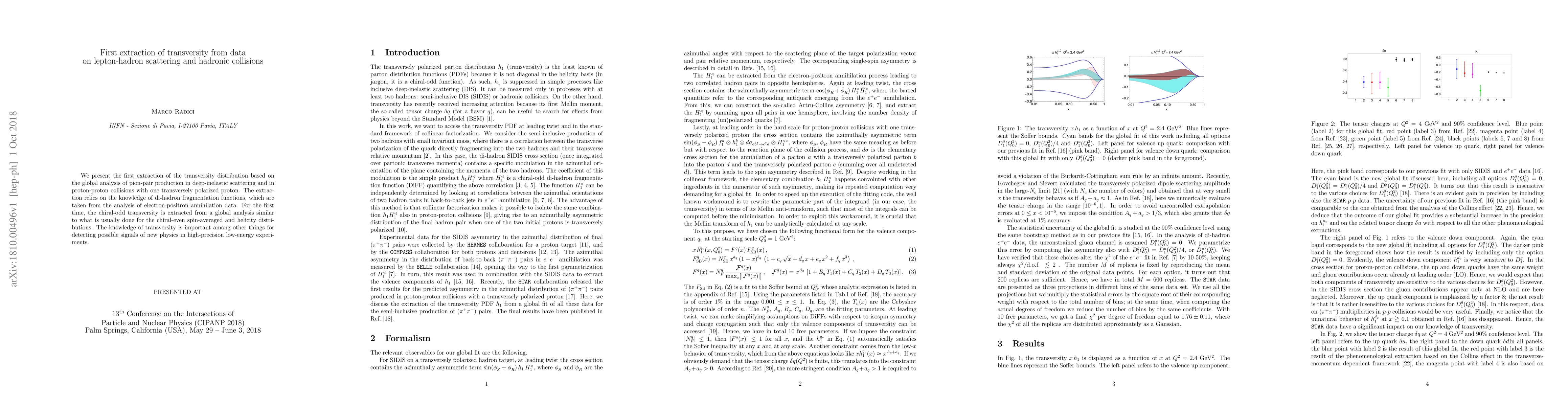 This paper reports the first extraction of the transversity distribution from data on pion-pair production in deep-inelastic scattering and proton-proton collisions. The analysis relies on di-hadron fragmentation functions derived from electron-positron annihilation data, providing insights into chiral-odd transversity and potential signals of new physics.