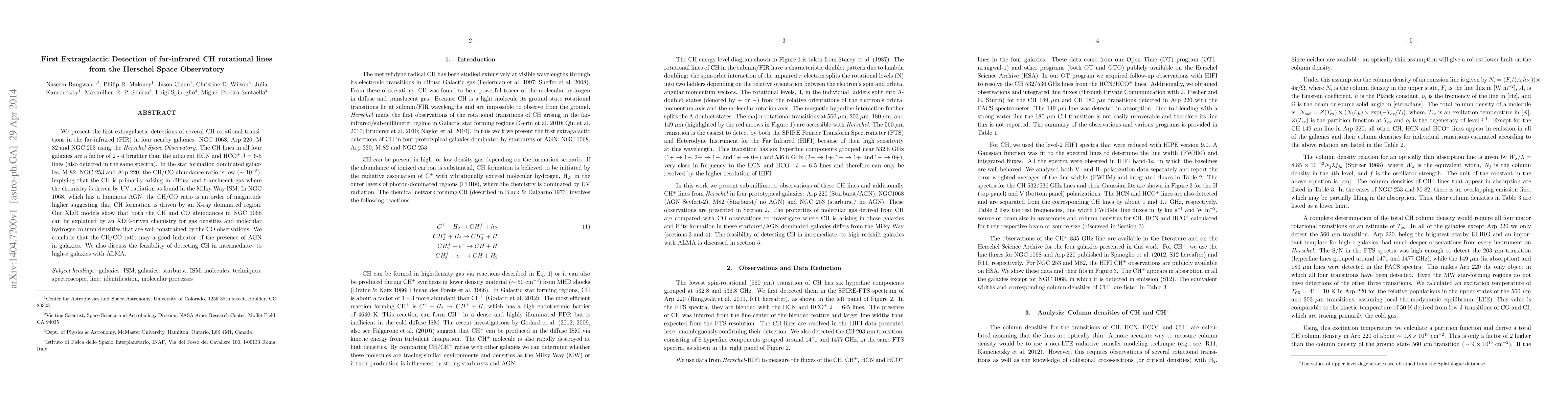 We present the first extragalactic detections of several CH rotational transitions in the far-infrared (FIR) in four nearby galaxies: NGC 1068, Arp 220, M 82 and NGC 253 using the \textit{Herschel Space Observatory}. The CH lines in all four galaxies are a factor of 2 - 4 brighter than the adjacent HCN and HCO+ J = 6-5 lines (also detected in the same spectra). In the star formation dominated galaxies, M 82, NGC 253 and Arp 220, the CH/CO abundance ratio is low (1e-5), implying that the CH is primarily arising in diffuse and translucent gas where the chemistry is driven by UV radiation as found in the Milky Way ISM. In NGC 1068, which has a luminous AGN, the CH/CO ratio is an order of magnitude higher suggesting that CH formation is driven by an X-ray dominated region. Our XDR models show that both the CH and CO abundances in NGC 1068 can be explained by an XDR-driven chemistry for gas densities and molecular hydrogen column densities that are well constrained by the CO observations. We conclude that the CH/CO ratio may a good indicator of the presence of AGN in galaxies. We also discuss the feasibility of detecting CH in intermediate- to high-z galaxies with ALMA.