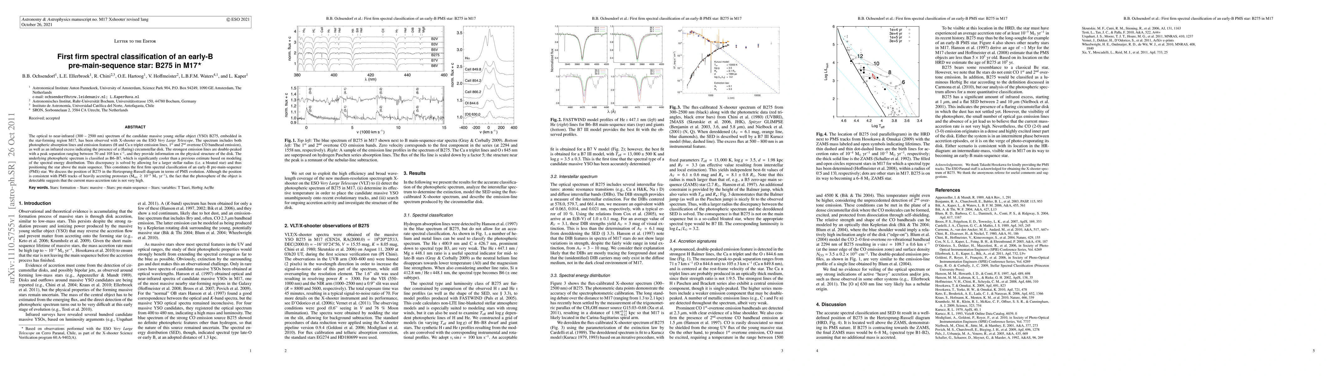 This paper presents the first firm spectral classification of an early-B pre-main-sequence star, B275 in M17, using detailed optical to near-infrared spectra. The star exhibits a bloated photosphere, classified as B6-B7, and shows evidence of a circumstellar disk with double-peaked emission lines, indicating accretion processes.