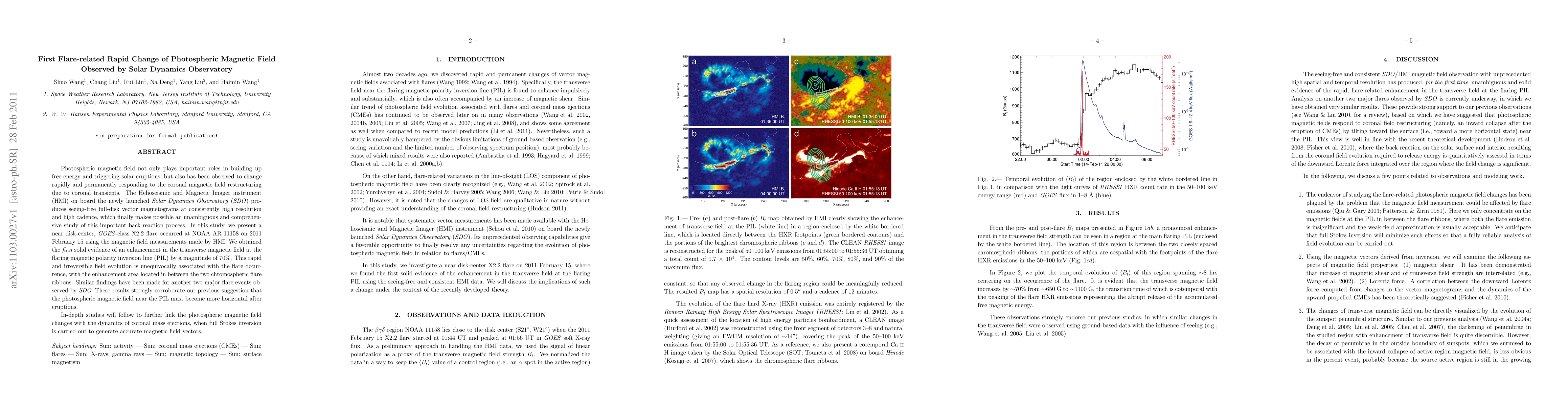 Photospheric magnetic field not only plays important roles in building up free energy and triggering solar eruptions, but also has been observed to change rapidly and permanently responding to the coronal magnetic field restructuring due to coronal transients. The Helioseismic and Magnetic Imager instrument (HMI) on board the newly launched Solar Dynamics Observatory (SDO) produces seeing-free full-disk vector magnetograms at consistently high resolution and high cadence, which finally makes possible an unambiguous and comprehensive study of this important back-reaction process. In this study, we present a near disk-center, GOES-class X2.2 flare occurred at NOAA AR 11158 on 2011 February 15 using the magnetic field measurements made by HMI. We obtained the first solid evidence of an enhancement in the transverse magnetic field at the flaring magnetic polarity inversion line (PIL) by a magnitude of 70%. This rapid and irreversible field evolution is unequivocally associated with the flare occurrence, with the enhancement area located in between the two chromospheric flare ribbons. Similar findings have been made for another two major flare events observed by SDO. These results strongly corroborate our previous suggestion that the photospheric magnetic field near the PIL must become more horizontal after eruptions. In-depth studies will follow to further link the photospheric magnetic field changes with the dynamics of coronal mass ejections, when full Stokes inversion is carried out to generate accurate magnetic field vectors.
