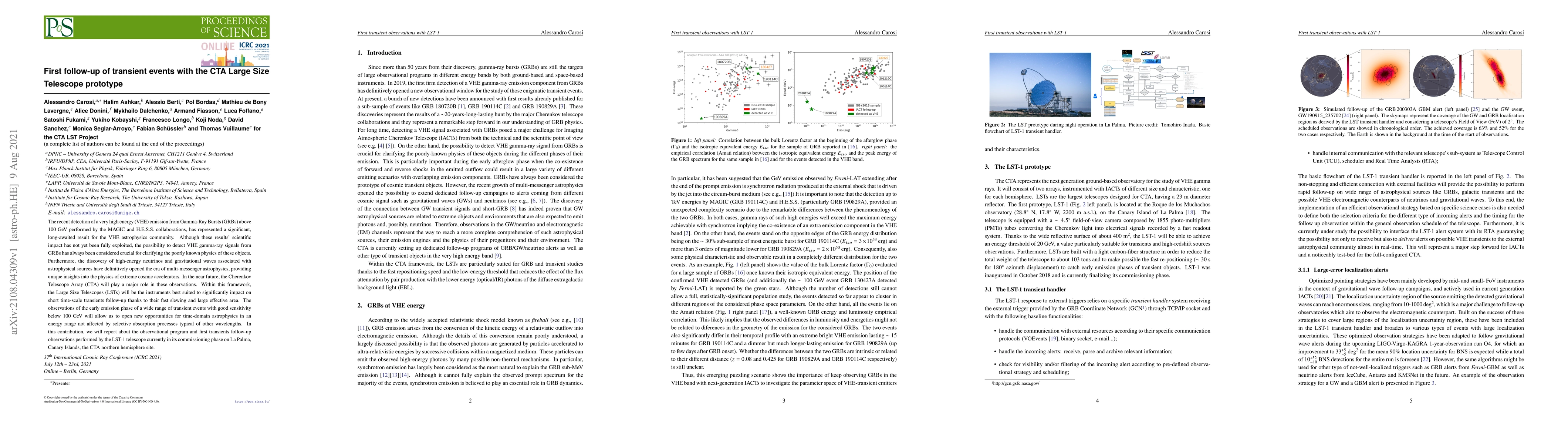 The recent detection of a very high energy (VHE) emission from Gamma-Ray Bursts (GRBs) above 100 GeV performed by the MAGIC and H.E.S.S. collaborations, has represented a significant, long-awaited result for the VHE astrophysics community. Although these results' scientific impact has not yet been fully exploited, the possibility to detect VHE gamma-ray signals from GRBs has always been considered crucial for clarifying the poorly known physics of these objects. Furthermore, the discovery of high-energy neutrinos and gravitational waves associated with astrophysical sources have definitively opened the era of multi-messenger astrophysics, providing unique insights into the physics of extreme cosmic accelerators. In the near future, the Cherenkov Telescope Array (CTA) will play a major role in these observations. Within this framework, the Large Size Telescopes (LSTs) will be the instruments best suited to significantly impact on short time-scale transients follow-up thanks to their fast slewing and large effective area. The observations of the early emission phase of a wide range of transient events with good sensitivity below 100 GeV will allow us to open new opportunities for time-domain astrophysics in an energy range not affected by selective absorption processes typical of other wavelengths. In this contribution, we will report about the observational program and first transients follow-up observations performed by the LST-1 telescope currently in its commissioning phase on La Palma, Canary Islands, the CTA northern hemisphere site.