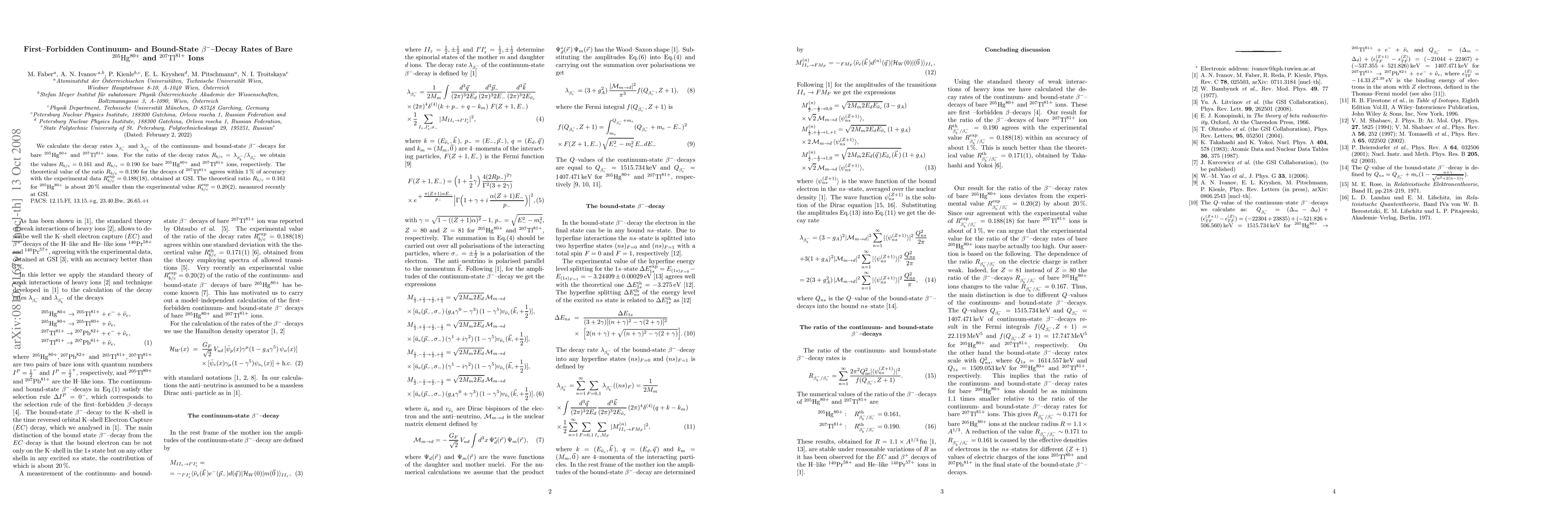 Researchers calculate the decay rates of beta^- decays for two ions, 205Hg80+ and 207Tl81+, finding a ratio of 0.161 and 0.190 respectively, with some discrepancies compared to experimental data.
