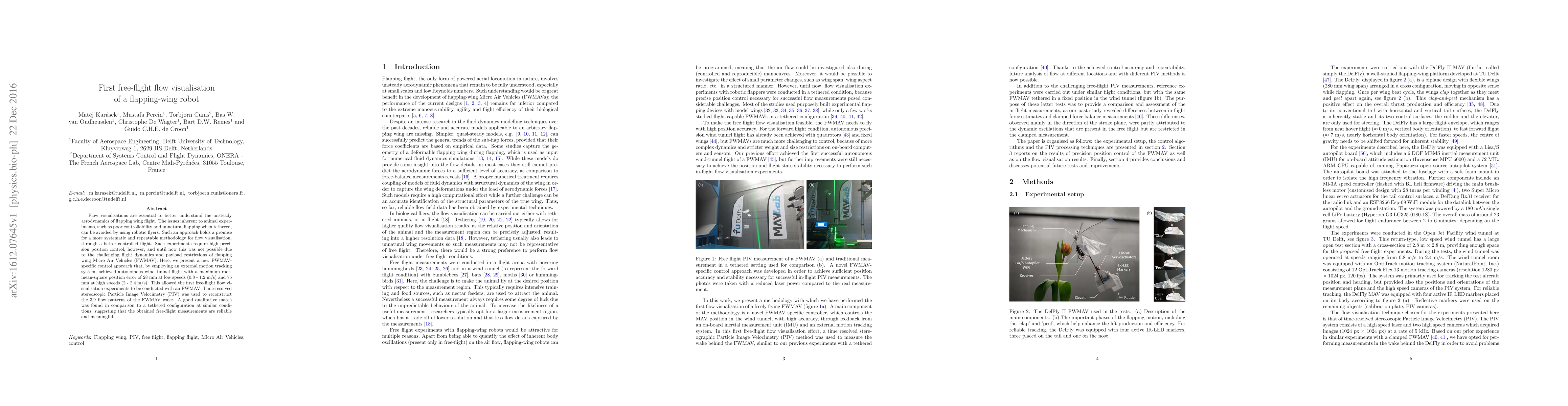 Flow visualisations are essential to better understand the unsteady aerodynamics of flapping wing flight. The issues inherent to animal experiments, such as poor controllability and unnatural flapping when tethered, can be avoided by using robotic flyers. Such an approach holds a promise for a more systematic and repeatable methodology for flow visualisation, through a better controlled flight. Such experiments require high precision position control, however, and until now this was not possible due to the challenging flight dynamics and payload restrictions of flapping wing Micro Air Vehicles (FWMAV). Here, we present a new FWMAV-specific control approach that, by employing an external motion tracking system, achieved autonomous wind tunnel flight with a maximum root-mean-square position error of 28 mm at low speeds (0.8 - 1.2 m/s) and 75 mm at high speeds (2 - 2.4 m/s). This allowed the first free-flight flow visualisation experiments to be conducted with an FWMAV. Time-resolved stereoscopic Particle Image Velocimetry (PIV) was used to reconstruct the 3D flow patterns of the FWMAV wake. A good qualitative match was found in comparison to a tethered configuration at similar conditions, suggesting that the obtained free-flight measurements are reliable and meaningful.