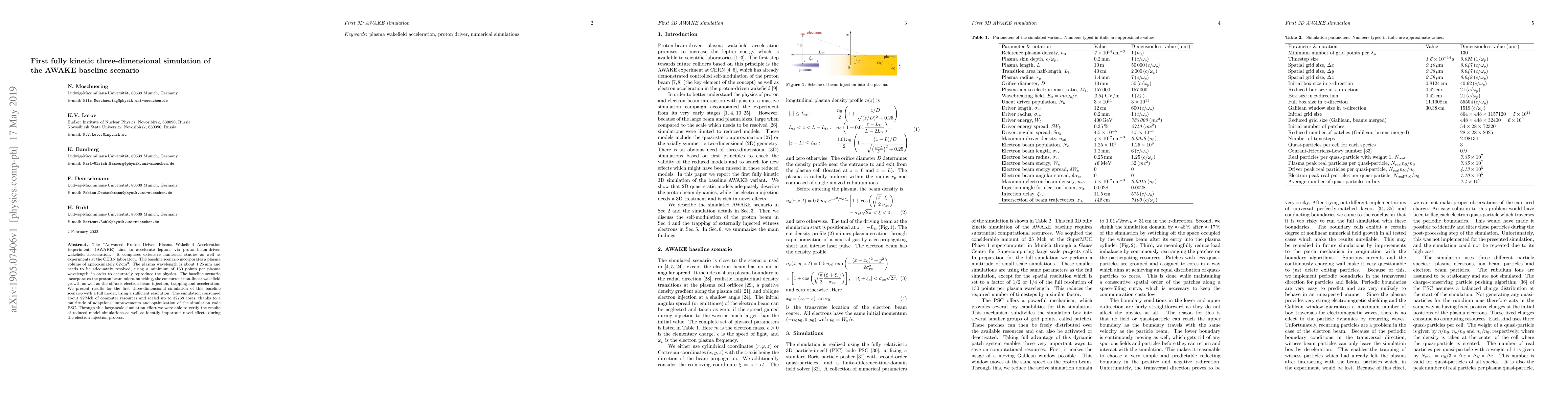 This paper presents the first fully kinetic three-dimensional simulation of the AWAKE baseline scenario, which aims to accelerate leptons via proton-beam-driven wakefield acceleration. The simulation verified previous results and identified novel effects during electron injection, consuming 22 million computer hours and scaling to 32,768 cores.