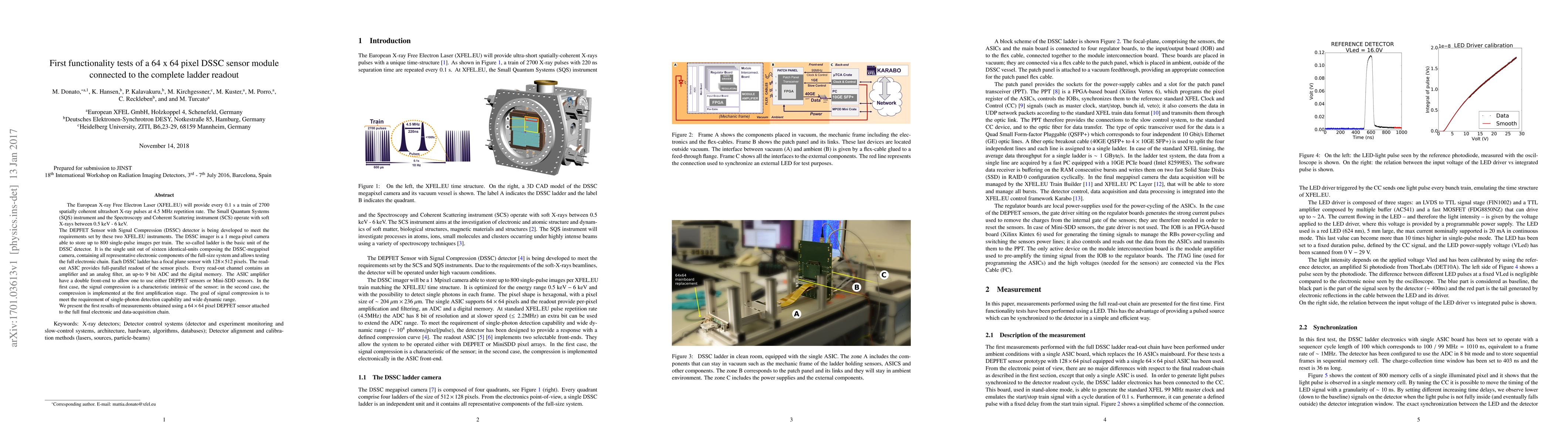 The European X-ray Free Electron Laser (XFEL.EU) will provide every 0.1 s a train of 2700 spatially coherent ultrashort X-ray pulses at 4.5 MHz repetition rate. The Small Quantum Systems (SQS) instrument and the Spectroscopy and Coherent Scattering instrument (SCS) operate with soft X-rays between 0.5 keV - 6keV. The DEPFET Sensor with Signal Compression (DSSC) detector is being developed to meet the requirements set by these two XFEL.EU instruments. The DSSC imager is a 1 mega-pixel camera able to store up to 800 single-pulse images per train. The so-called ladder is the basic unit of the DSSC detector. It is the single unit out of sixteen identical-units composing the DSSC-megapixel camera, containing all representative electronic components of the full-size system and allows testing the full electronic chain. Each DSSC ladder has a focal plane sensor with 128 x 512 pixels. The read-out ASIC provides full-parallel readout of the sensor pixels. Every read-out channel contains an amplifier and an analog filter, an up-to 9 bit ADC and the digital memory. The ASIC amplifier have a double front-end to allow one to use either DEPFET sensors or Mini-SDD sensors. In the first case, the signal compression is a characteristic intrinsic of the sensor; in the second case, the compression is implemented at the first amplification stage. The goal of signal compression is to meet the requirement of single-photon detection capability and wide dynamic range. We present the first results of measurements obtained using a 64 x 64 pixel DEPFET sensor attached to the full final electronic and data-acquisition chain.