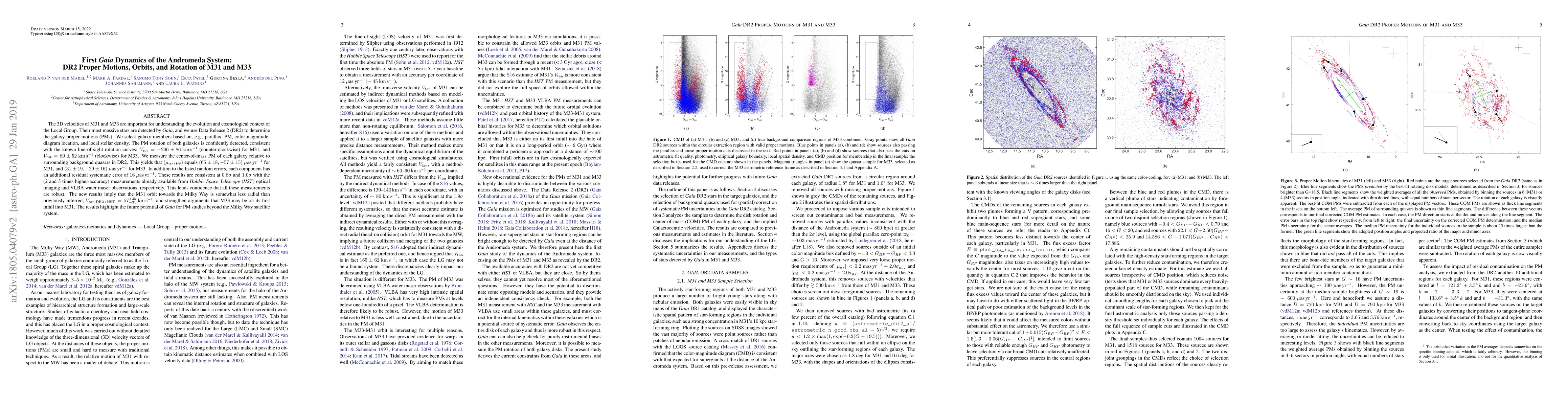 This paper uses Gaia DR2 data to determine the proper motions, orbits, and rotation of M31 and M33, revealing their 3D velocities and confirming their rotation curves. The results suggest M31's orbit towards the Milky Way is less radial, and M33 may be on its first infall into M31, highlighting Gaia's potential for extragalactic studies.