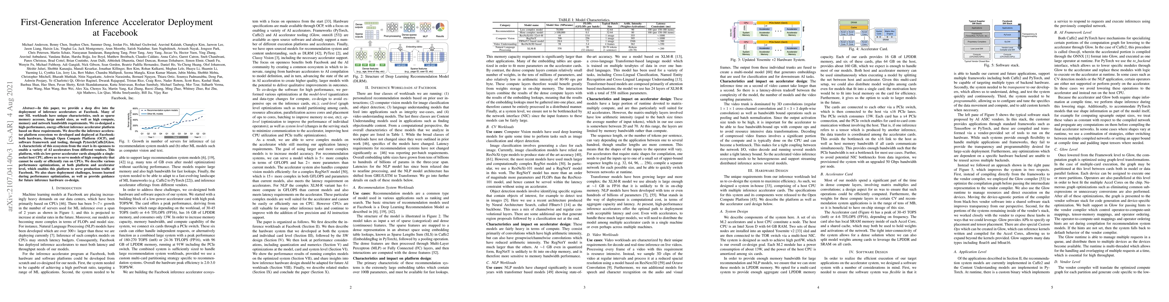 This paper details Facebook's deployment of a co-designed, high-performance inference accelerator platform to handle unique ML workloads, including sparse memory accesses and large model sizes. The platform integrates hardware accelerators and software frameworks like Pytorch, enabling efficient model serving and offering insights into the optimizations and challenges encountered during deployment.