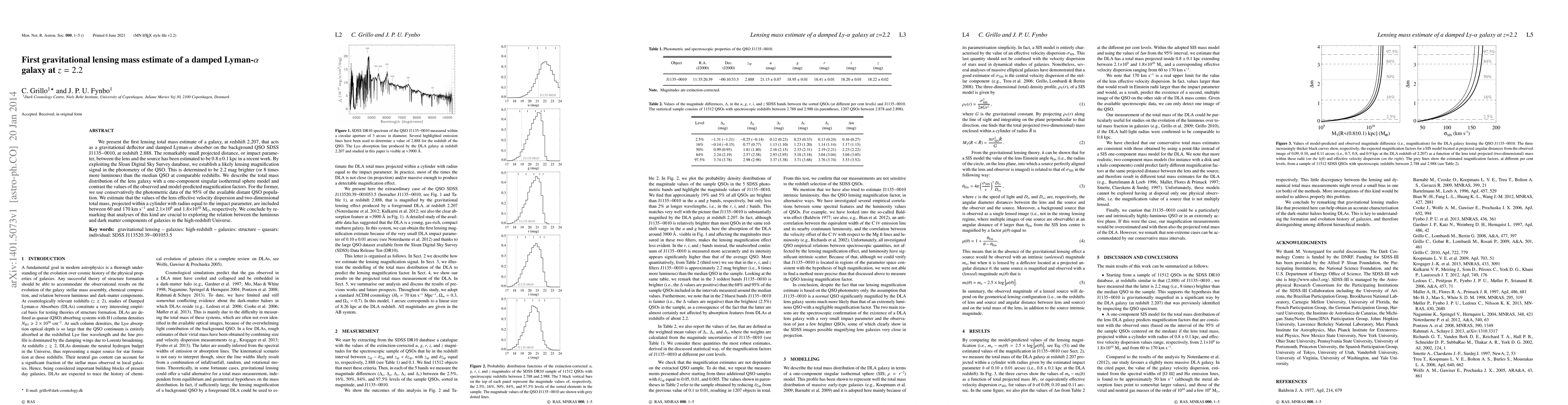 This paper presents the first gravitational lensing mass estimate of a damped Lyman-alpha galaxy at redshift 2.2, revealing a total mass between 2.1 x 10^9 and 1.8 x 10^10 M_Sun, and highlights the importance of such analyses in understanding high-redshift galaxy dynamics.