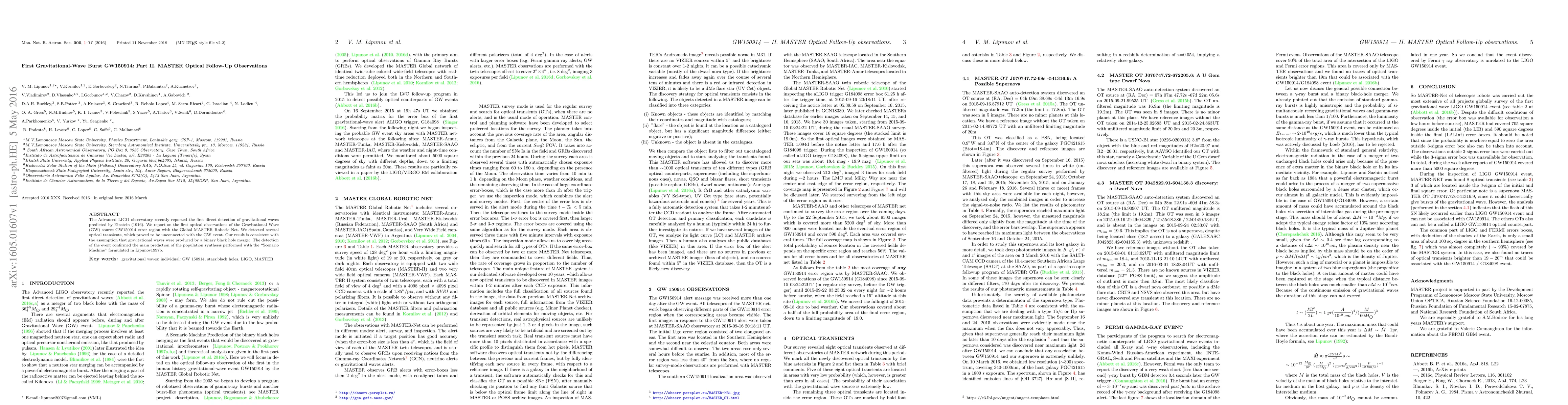 The Advanced LIGO observatory recently reported the first direct detection of gravitational waves predicted by Einstein (1916). We report on the first optical observations of the Gravitational Wave (GW) source GW150914 error region with the Global MASTER Robotic Net. We detected several optical transients, which proved to be unconnected with the GW event. Our result is consistent with the assumption that gravitational waves were produced by a binary black hole merger. The detection of the event confirmed the main prediction of the population synthesis performed with the "Scenario Machine" formulated in Lipunov1997b.