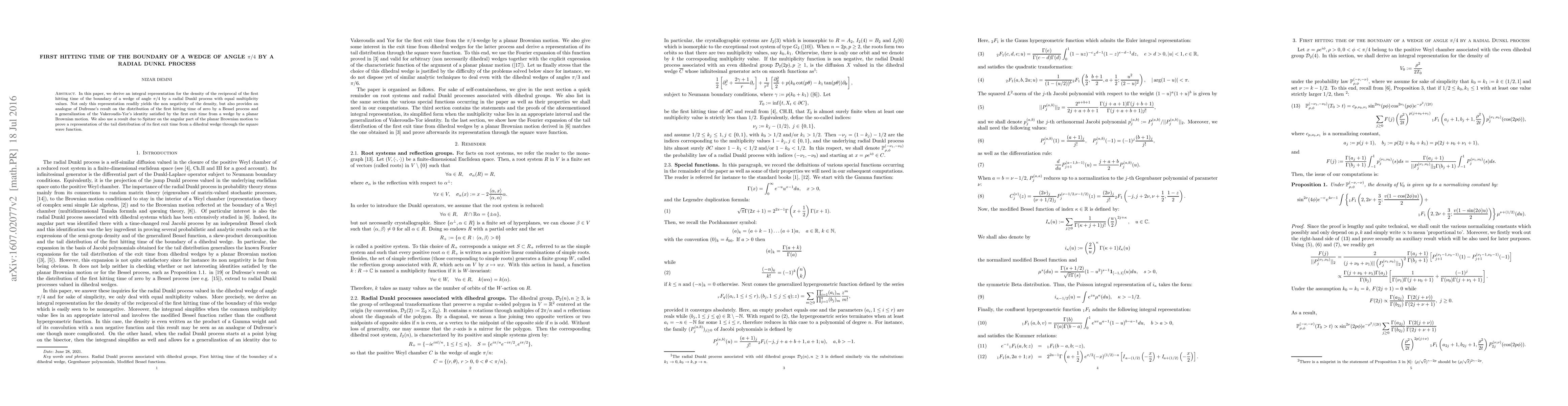 This paper derives an integral representation for the density of the reciprocal of the first hitting time of a $\pi/4$ wedge boundary by a radial Dunkl process, establishing its non-negativity and generalizing results from Bessel processes and planar Brownian motion. Additionally, it uses Spitzer's result to represent the tail distribution of the first exit time from a dihedral wedge via the square wave function.