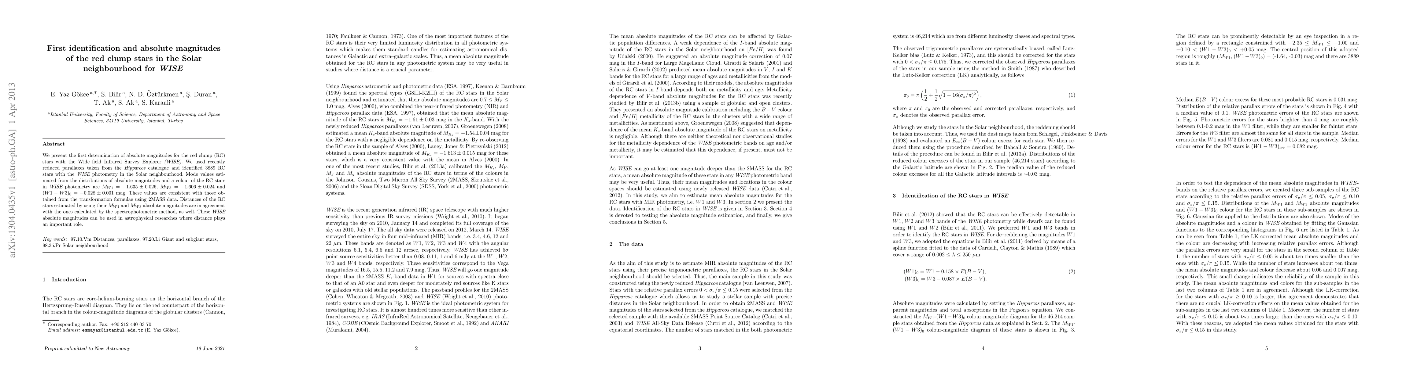 This paper identifies 3889 red clump stars in the Solar neighbourhood using WISE data and determines their absolute magnitudes, finding M_{W1}=-1.635(0.026) and M_{W3}=-1.606(0.024), which are consistent with 2MASS transformations and spectrophotometric distance calculations.