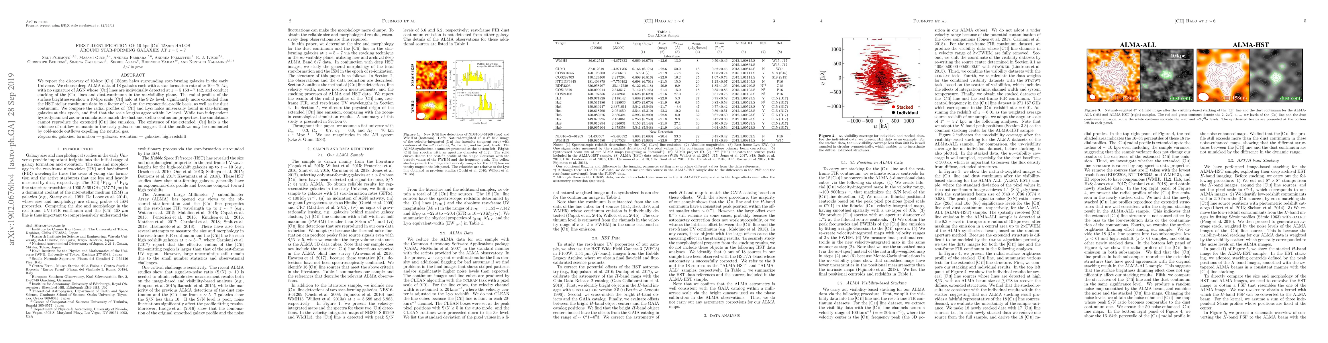 This paper discovers 10-kpc scale [CII] halos surrounding star-forming galaxies at z=5-7, suggesting outflow remnants in early galaxies.
