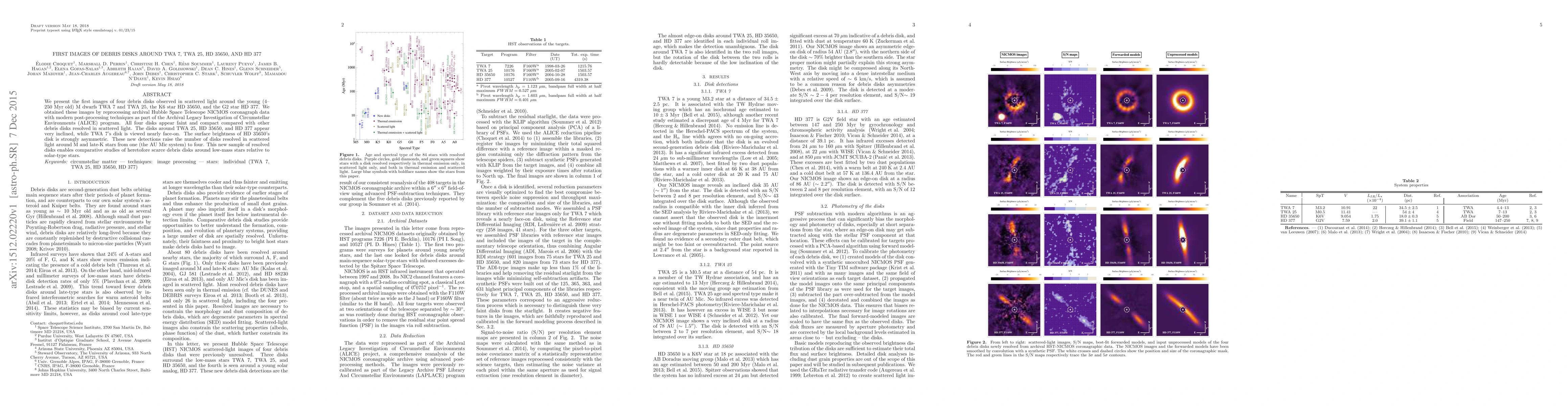 This paper presents the first images of four debris disks around young stars using reprocessed Hubble Space Telescope data, revealing faint, compact disks that provide new insights into debris disks around low-mass stars. These findings enhance comparative studies of debris disks and increase the number of resolved disks around M and late-K stars from one to four.