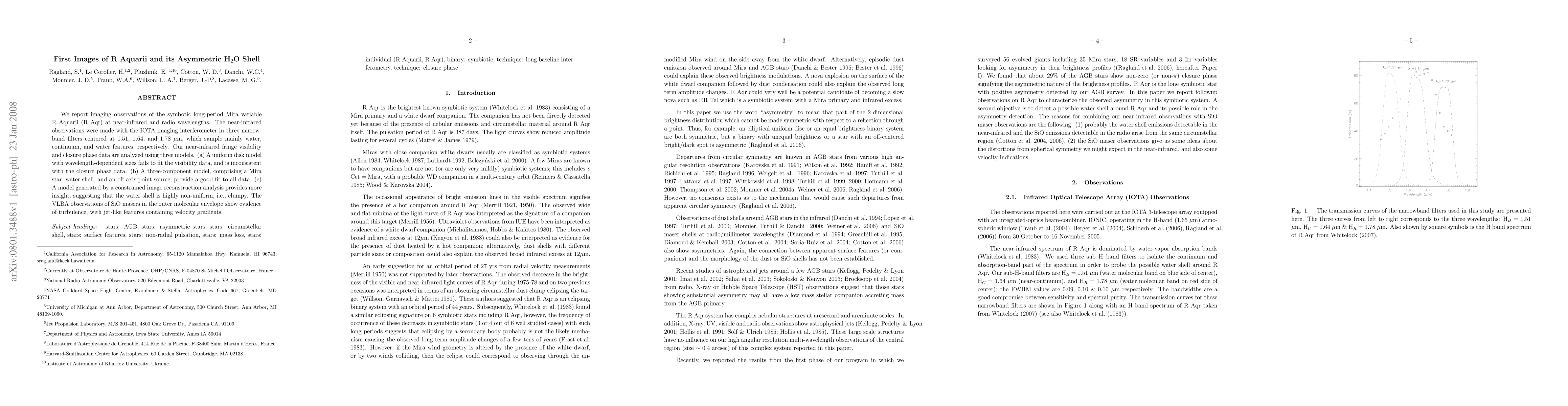 We report imaging observations of the symbotic long-period Mira variable R Aquarii (R Aqr) at near-infrared and radio wavelengths. The near-infrared observations were made with the IOTA imaging interferometer in three narrow-band filters centered at 1.51, 1.64, and 1.78 $\mu$m, which sample mainly water, continuum, and water features, respectively. Our near-infrared fringe visibility and closure phase data are analyzed using three models. (a) A uniform disk model with wavelength-dependent sizes fails to fit the visibility data, and is inconsistent with the closure phase data. (b) A three- component model, comprising a Mira star, water shell, and an off-axis point source, provide a good fit to all data. (c) A model generated by a constrained image reconstruction analysis provides more insight, suggesting that the water shell is highly non-uniform, i.e., clumpy. The VLBA observations of SiO masers in the outer molecular envelope show evidence of turbulence, with jet-like features containing velocity gradients.
