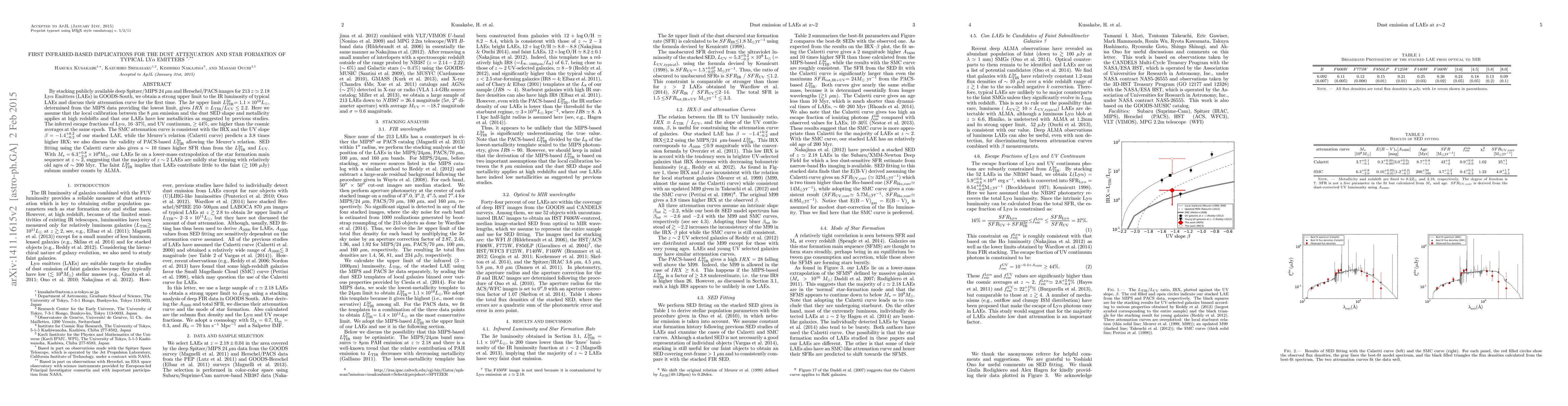 By stacking publicly available deep Spitzer/MIPS 24 $\mu$m and Herschel/PACS images for 213 $z \simeq 2.18$ Ly$\alpha$ Emitters (LAEs) in GOODS-South, we obtain a strong upper limit to the IR luminosity of typical LAEs and discuss their attenuation curve for the first time. The $3\sigma$ upper limit $L_{\rm TIR}^{3\sigma}= 1.1 \times 10^{10} L_\odot$, determined from the MIPS data providing the lowest limit, gives $IRX \equiv L_{\rm TIR}/L_{\rm UV} \leq 2.2$. Here we assume that the local calibration between the 8 $\mu$m emission and the dust SED shape and metallicity applies at high redshifts and that our LAEs have low metallicities as suggested by previous studies. The inferred escape fractions of Ly$\alpha$, $16$--$37%$, and UV continuum, $\ge 44%$, are higher than the cosmic averages at the same epoch. The SMC attenuation curve is consistent with the IRX and the UV slope $\beta = -1.4^{+0.2}_{-0.2}$ of our stacked LAE, while the Meurer's relation (Calzetti curve) predicts a 3.8 times higher IRX; we also discuss the validity of PACS-based $L_{\rm TIR}^{3\sigma}$ allowing the Meurer's relation. SED fitting using the Calzetti curve also gives a $\sim 10$ times higher SFR than from the $L_{\rm TIR}^{3\sigma}$ and $L_{\rm UV}$. With $M_{\star}=6.3^{+0.8}_{-2.0} \times10^8 \mathrm{M_{\odot}}$, our LAEs lie on a lower-mass extrapolation of the star formation main sequence at $z \sim 2$, suggesting that the majority of $z \sim 2$ LAEs are mildly star forming with relatively old ages of $\sim 200$ Myr. The faint $L_{\rm TIR}^{3\sigma}$ implies that LAEs contribute little to the faint ($\gtrsim 100 \mu$Jy) submm number counts by ALMA.