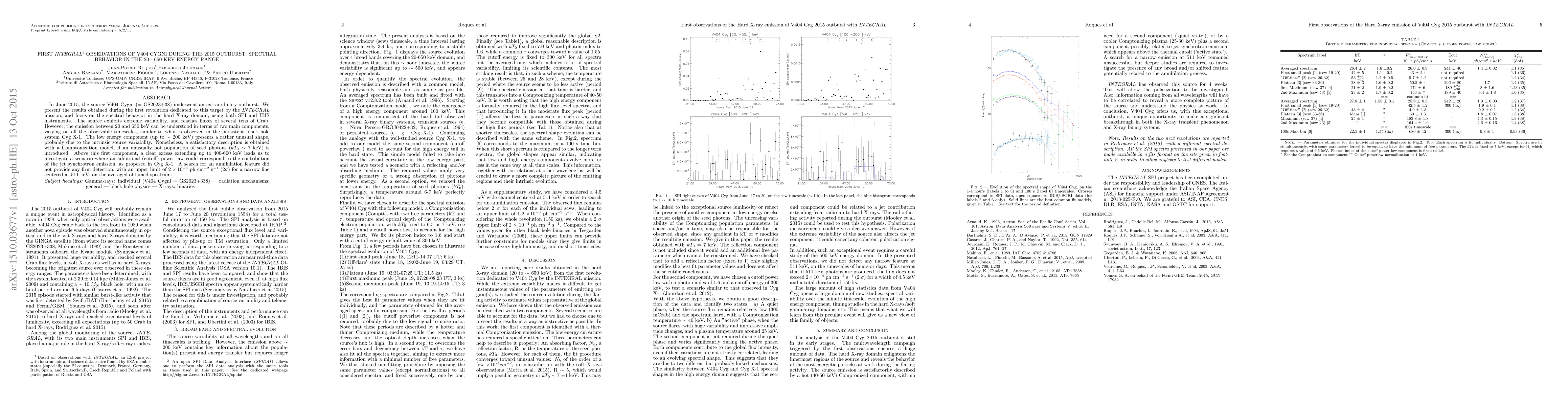 In June 2015, the source V404 Cygni (= GS2023+38) underwent an extraordinary outburst. We present the results obtained during the first revolution dedicated to this target by the INTEGRAL mission, and focus on the spectral behavior in the hard X-ray domain, using both SPI and IBIS instruments. The source exhibits extreme variability, and reaches fluxes of several tens of Crab. However, the emission between 20 and 650 keV can be understood in terms of two main components, varying on all the observable timescales, similar to what is observed in the persistent black hole system Cyg X-1. The low energy component (up to ~ 200 keV) presents a rather unusual shape, probably due to the intrinsic source variability. Nonetheless, a satisfactory description is obtained with a Comptonization model, if an unusually hot population of seed photons ($kT_0$ ~ 7 keV) is introduced. Above this first component, a clear excess extending up to 400-600 keV leads us to investigate a scenario where an additional (cutoff) power law could correspond to the contribution of the jet synchrotron emission, as proposed in Cyg X-1. A search for an annihilation feature did not provide any firm detection, with an upper limit of 2 x $10^{-4} ph/cm^2 s$ (2 \sigma) for a narrow line centered at 511 keV, on the averaged obtained spectrum.