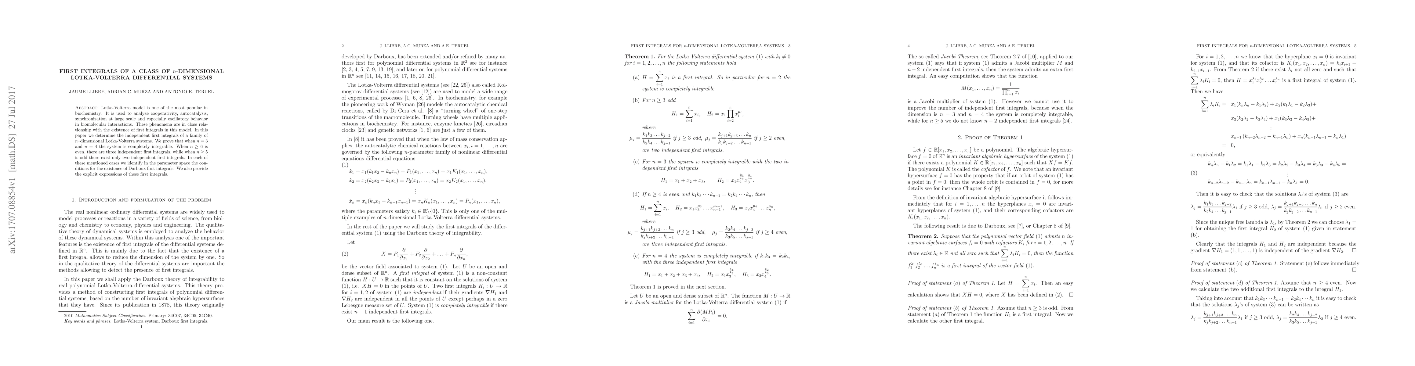 This paper investigates the first integrals of $n$-dimensional Lotka-Volterra systems, proving complete integrability for $n=3$ and $n=4$. It identifies three independent first integrals for even $n\geq6$ and two for odd $n\geq5$, providing explicit expressions and conditions for the existence of these integrals in the parameter space.