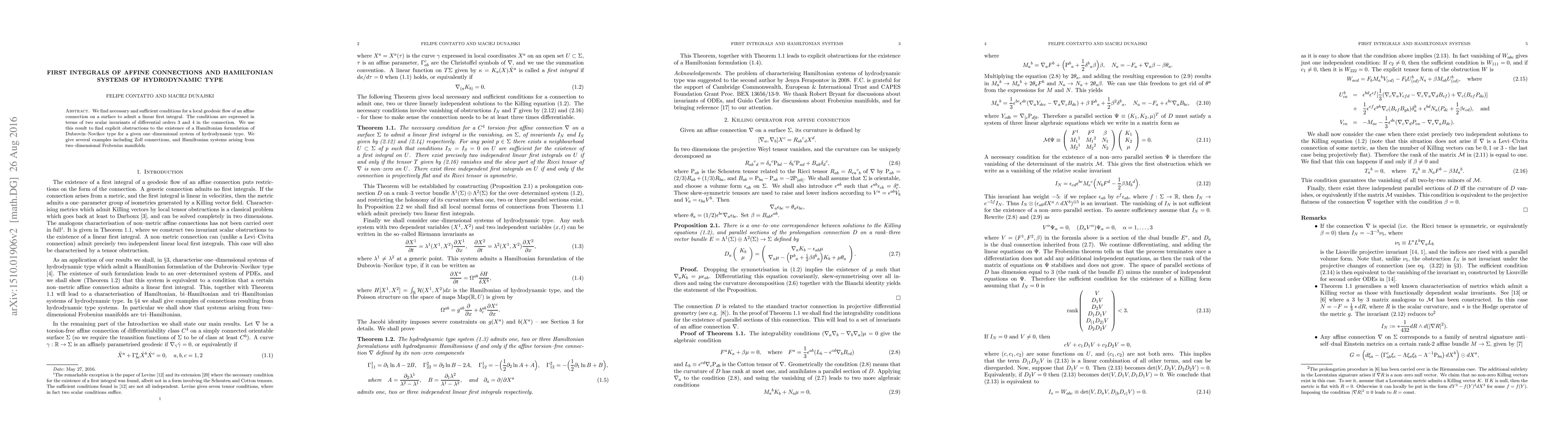 Researchers found conditions for a linear first integral in affine connections on surfaces, using scalar invariants to determine its existence. This result helps identify obstructions to Hamiltonian formulations of Dubrovin-Novikov type for hydrodynamic systems.