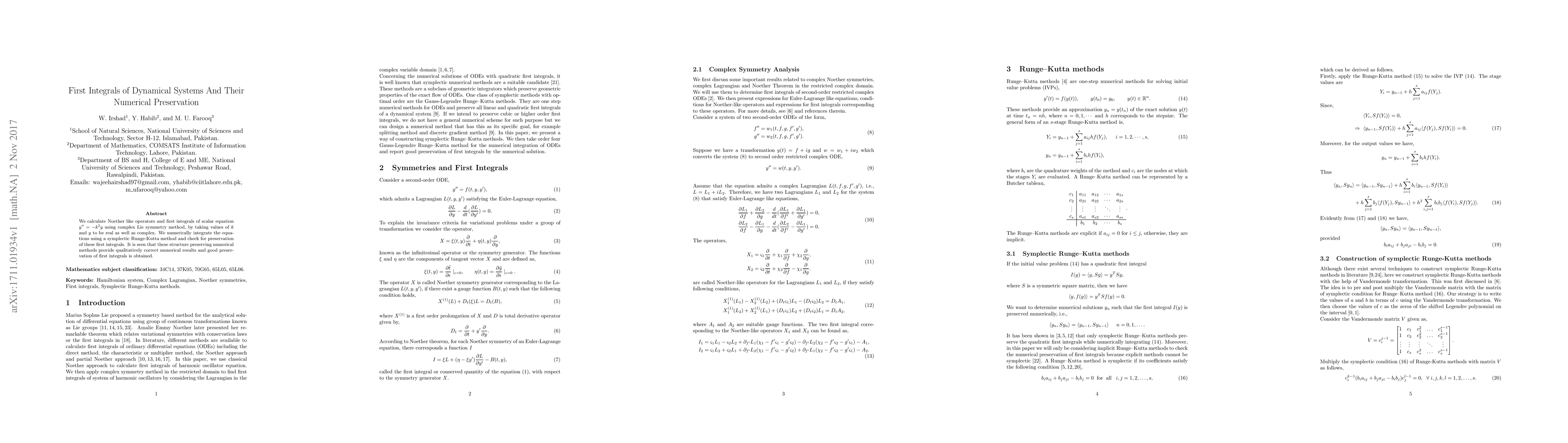 We calculate Noether like operators and first integrals of scalar equation y'' = -k^2 y using complex Lie symmetry method, by taking values of k and y to be real as well as complex. We numerically integrate the equations using a symplectic Runge-Kutta method and check for preservation of these first integrals. It is seen that these structure preserving numerical methods provide qualitatively correct numerical results and good preservation of first integrals is obtained.