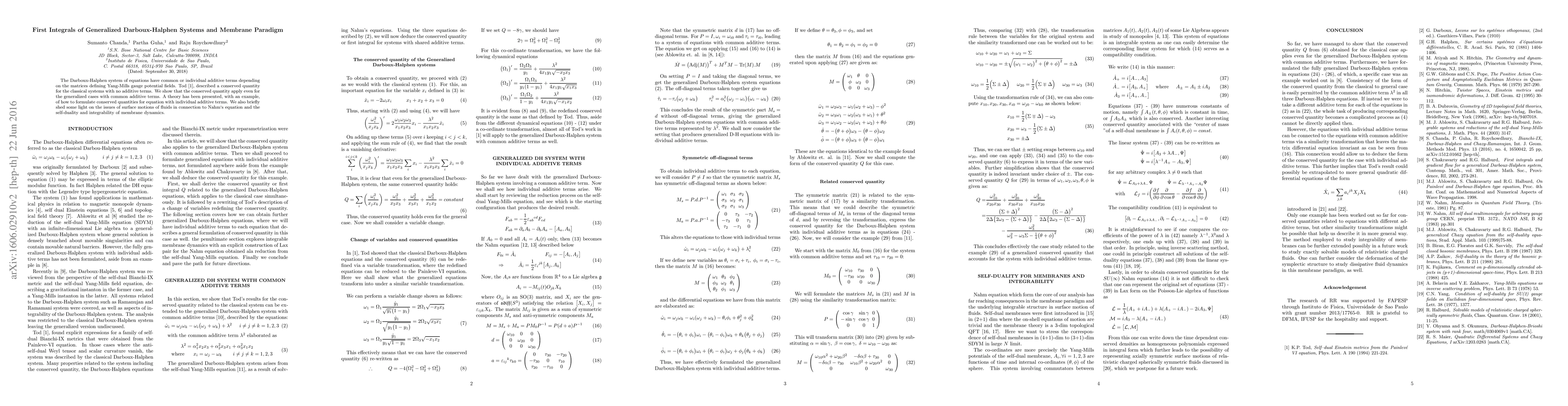The Darboux-Halphen system of equations have common or individual additive terms depending on the matrices defining Yang-Mills gauge potential fields. Tod (Phys. Lett. A 190 (1994) 221-224), described a conserved quantity for the classical systems with no additive terms. We show that the conserved quantity apply even for the generalized cases with common additive terms. A theory has been presented, with an example, of how to formulate conserved quantities for equation with individual additive terms. We also briefly shed some light on the issues of surface motions of fluids in conncetion to Nahm`s equation and the self-duality and integrability of membrane dynamics.