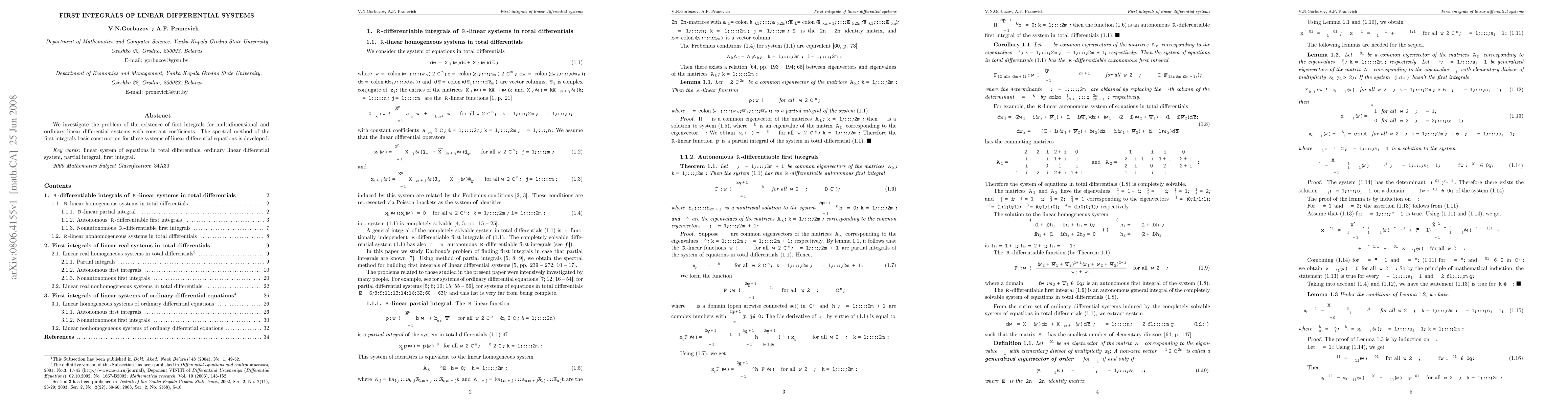This paper explores the existence of first integrals for linear differential systems with constant coefficients, developing a spectral method to construct a basis of first integrals for these systems. The focus is on both multidimensional and ordinary linear differential equations.
