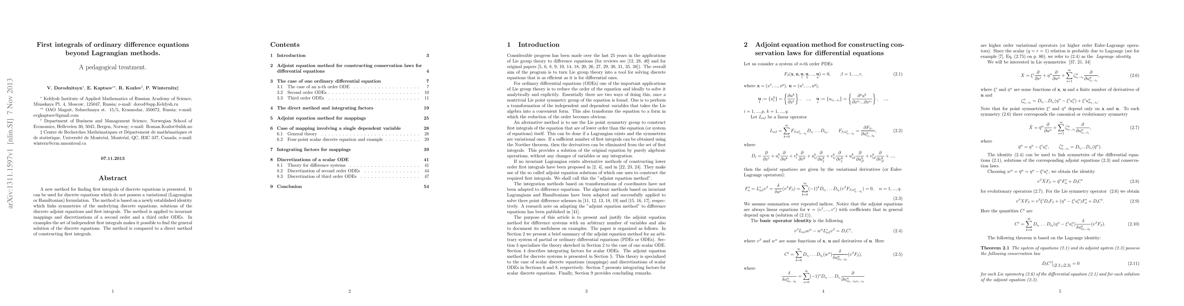 This paper introduces a novel method for identifying first integrals of discrete equations lacking a variational formulation, based on a new identity linking symmetries and adjoint solutions. The method is demonstrated on invariant mappings and discretizations of second and third-order ODEs, showing its ability to find general solutions.