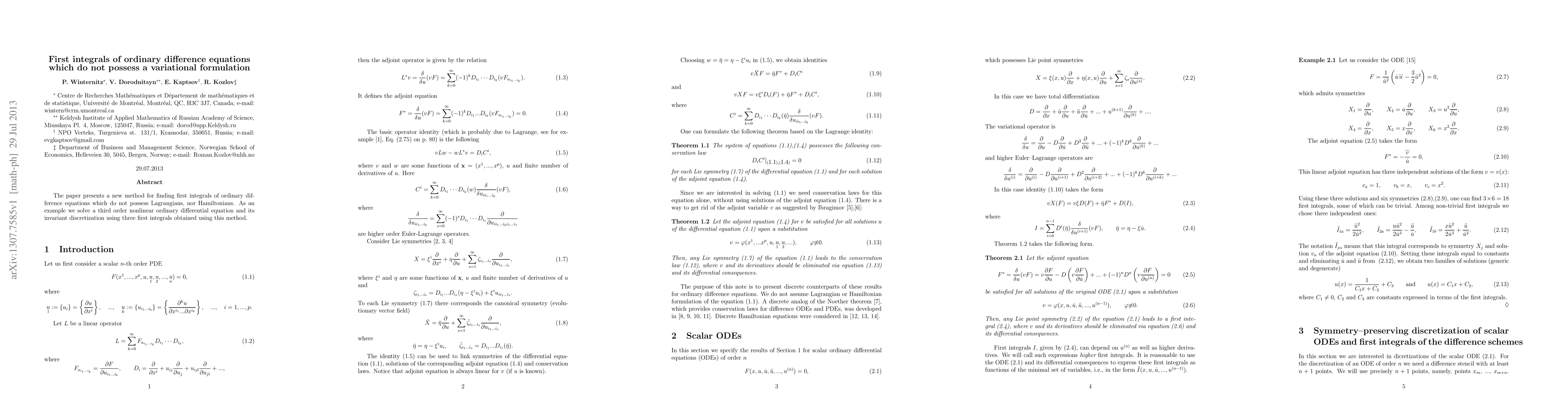 The paper introduces a novel technique to identify first integrals for ordinary difference equations lacking variational formulations. It demonstrates the method by solving a third-order nonlinear ordinary differential equation and its discretized version using three derived first integrals.