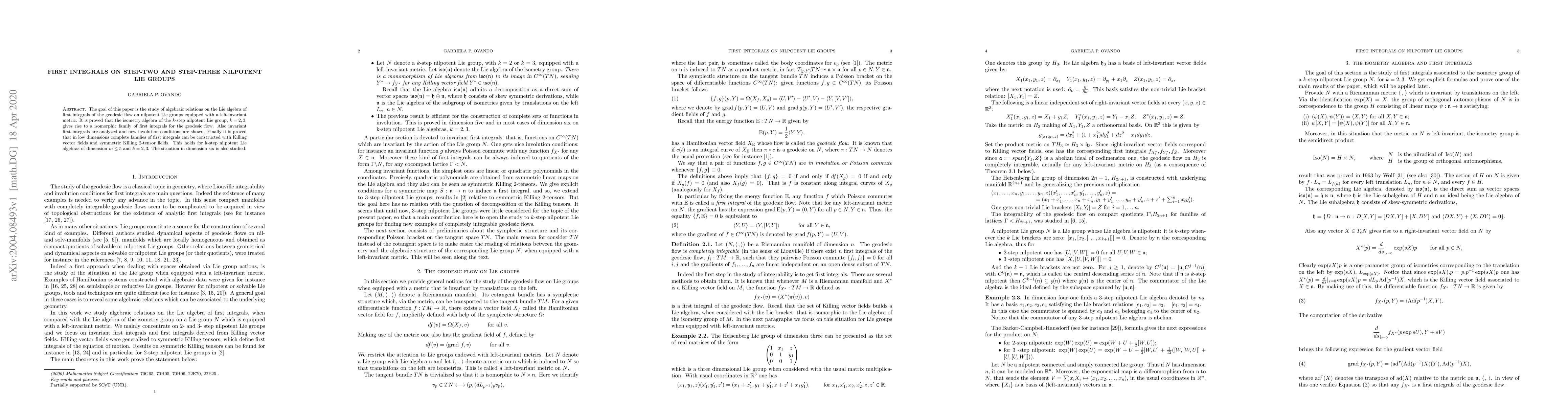 The goal of this paper is the study of algebraic relations on the Lie algebra of first integrals of the geodesic flow on nilpotent Lie groups equipped with a left-invariant metric. It is proved that the isometry algebra of the $k$-step nilpotent Lie group, $k=2,3$, gives rise to a isomorphic family of first integrals for the geodesic flow. Also invariant first integrals are analyzed and new involution conditions are shown. Finally it is proved that in low dimensions complete families of first integrals can be constructed with Killing vector fields and symmetric Killing 2-tensor fields. This holds for k-step nilpotent Lie algebras of dimension $m\leq 5$ and $k=2,3$. The situation in dimension six is also studied.
