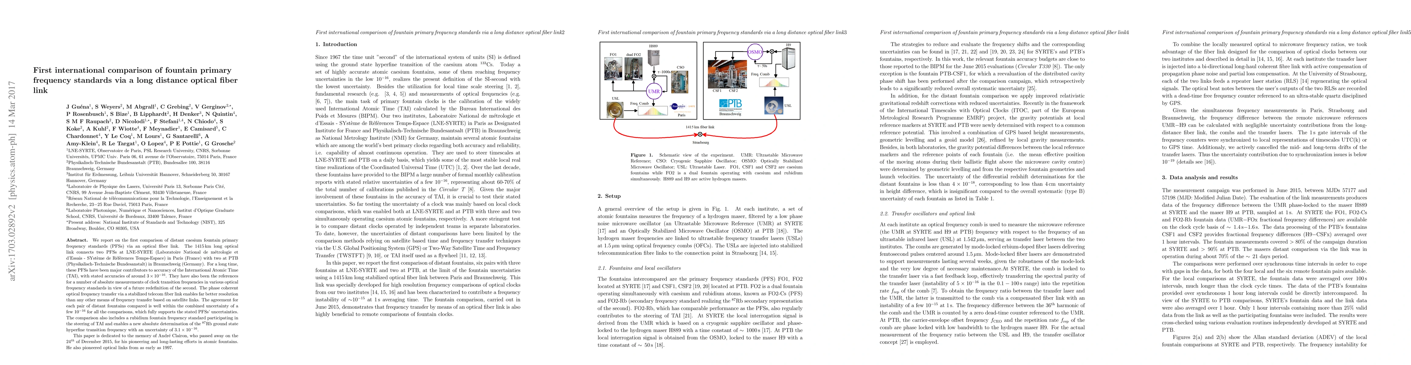 We report on the first comparison of distant caesium fountain primary frequency standards (PFSs) via an optical fiber link. The 1415 km long optical link connects two PFSs at LNE-SYRTE (Laboratoire National de m\'{e}trologie et d'Essais - SYst\`{e}me de R\'{e}f\'{e}rences Temps-Espace) in Paris (France) with two at PTB (Physikalisch-Technische Bundesanstalt) in Braunschweig (Germany). For a long time, these PFSs have been major contributors to accuracy of the International Atomic Time (TAI), with stated accuracies of around $3\times 10^{-16}$. They have also been the references for a number of absolute measurements of clock transition frequencies in various optical frequency standards in view of a future redefinition of the second. The phase coherent optical frequency transfer via a stabilized telecom fiber link enables far better resolution than any other means of frequency transfer based on satellite links. The agreement for each pair of distant fountains compared is well within the combined uncertainty of a few 10$^{-16}$ for all the comparisons, which fully supports the stated PFSs' uncertainties. The comparison also includes a rubidium fountain frequency standard participating in the steering of TAI and enables a new absolute determination of the $^{87}$Rb ground state hyperfine transition frequency with an uncertainty of $3.1\times 10^{-16}$. This paper is dedicated to the memory of Andr\'{e} Clairon, who passed away on the 24$^{th}$ of December 2015, for his pioneering and long-lasting efforts in atomic fountains. He also pioneered optical links from as early as 1997.