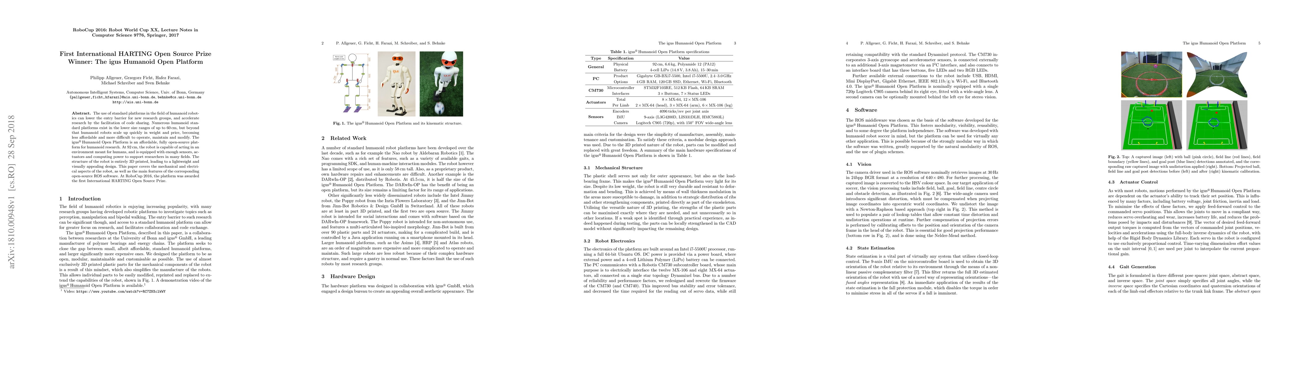 The igus Humanoid Open Platform is an affordable, open-source humanoid robot designed to lower entry barriers for research groups, featuring a 3D printed, lightweight structure and extensive sensors and computing capabilities. It won the first International HARTING Open Source Prize at RoboCup 2016.