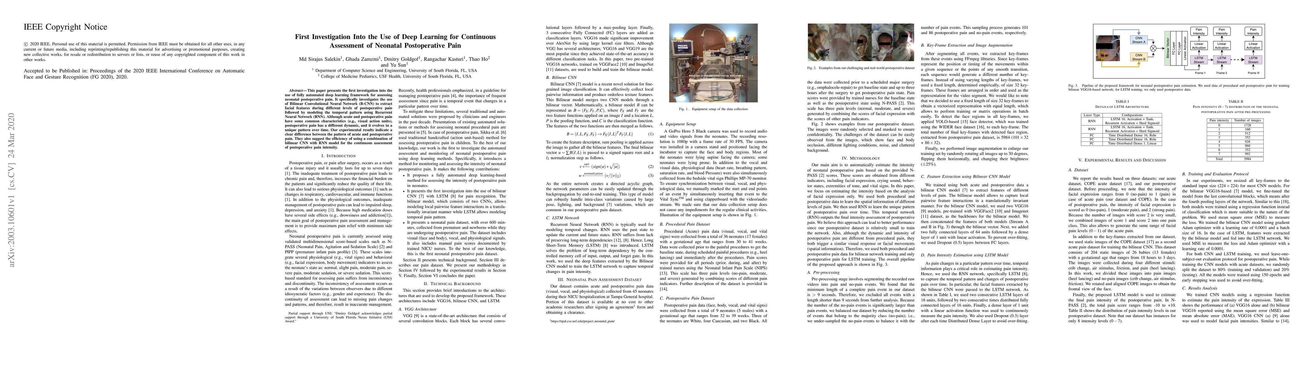 The research proposes a fully automated deep learning framework using Bilinear Convolutional Neural Network (B-CNN) for extracting facial features during different levels of neonatal postoperative pain, followed by modeling the temporal pattern using Recurrent Neural Network (RNN).