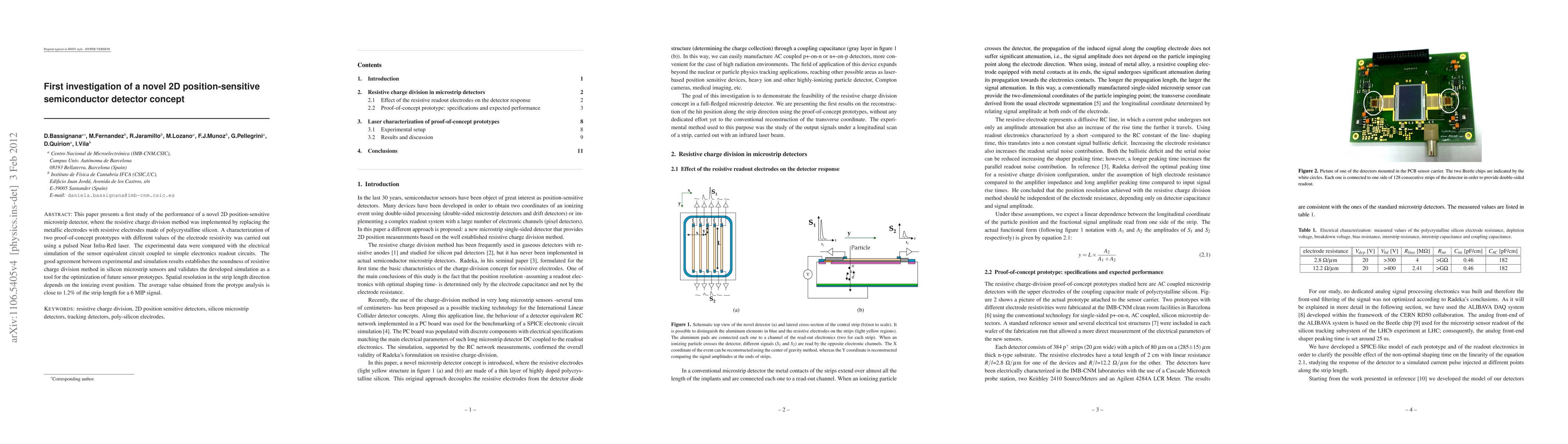 This paper presents a first study of the performance of a novel 2D position-sensitive microstrip detector, where the resistive charge division method was implemented by replacing the metallic electrodes with resistive electrodes made of polycrystalline silicon. A characterization of two proof-of-concept prototypes with different values of the electrode resistivity was carried out using a pulsed Near Infra-Red laser. The experimental data were compared with the electrical simulation of the sensor equivalent circuit coupled to simple electronics readout circuits. The good agreement between experimental and simulation results establishes the soundness of resistive charge division method in silicon microstrip sensors and validates the developed simulation as a tool for the optimization of future sensor prototypes. Spatial resolution in the strip length direction depends on the ionizing event position. The average value obtained from the protype analysis is close to 1.2% of the strip length for a 6 MIP signal.