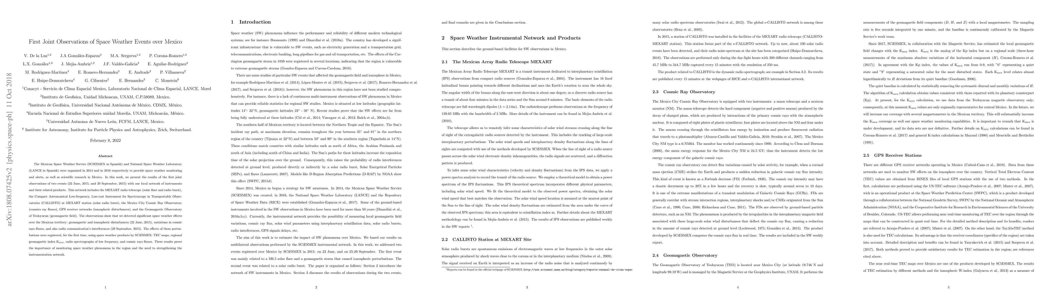The Mexican Space Weather Service (SCiESMEX in Spanish) and National Space Weather Laboratory (LANCE in Spanish) were organized in 2014 and in 2016 respectively to provide space weather monitoring and alerts, as well as scientific research in Mexico. In this work, we present the results of the first joint observations of two events (22 June, 2015, and 29 September, 2015) with our local network of instruments and their related products. This network includes the MEXART radio telescope (solar flare and radio burst), the Compact Astronomical Low-frequency, Low-cost Instrument for Spectroscopy in Transportable Observatories (CALLISTO) at MEXART station (solar radio burst), the Mexico City Cosmic Ray Observatory (cosmics ray fluxes), GPS receiver networks (ionospheric disturbances), and the Geomagnetic Observatory of Teoloyucan (geomagnetic field). The observations show that we detected significant space weather effects over the Mexican territory: geomagnetic and ionospheric disturbances (22 June, 2015), variations in cosmic rays fluxes, and also radio communications interferences (29 September, 2015). The effects of these perturbations were registered, for the first time, using space weather products by SCiESMEX: TEC maps, regional geomagnetic index K mex , radio spectrographs of low frequency, and cosmic rays fluxes. These results prove the importance of monitoring space weather phenomena in the region and the need to strengthening the instrumentation network.