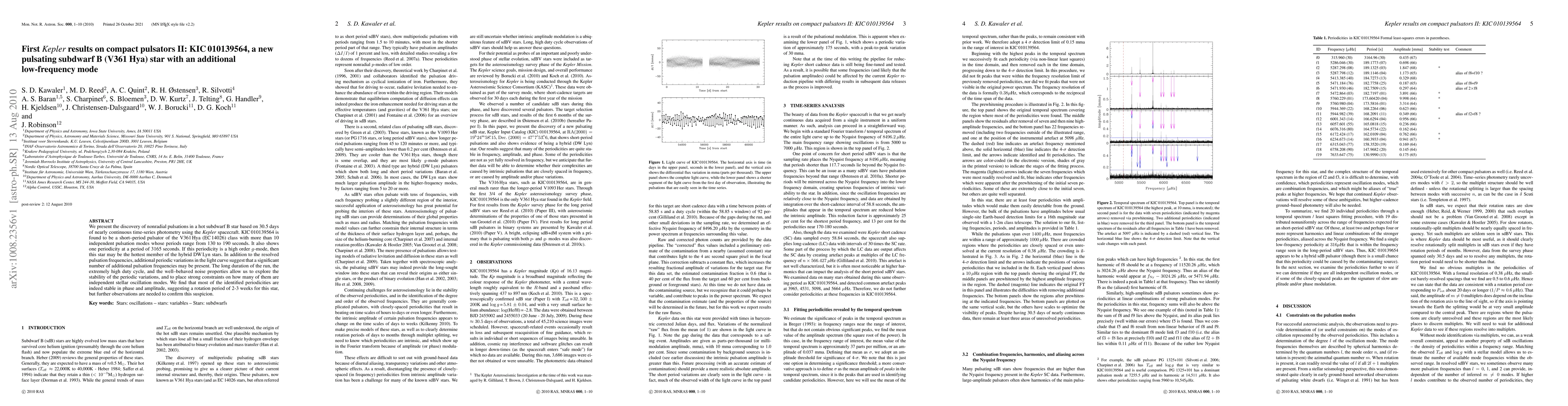 We present the discovery of nonradial pulsations in a hot subdwarf B star based on 30.5 days of nearly continuous time-series photometry using the \emph{Kepler} spacecraft. KIC 010139564 is found to be a short-period pulsator of the V361 Hya (EC 14026) class with more than 10 independent pulsation modes whose periods range from 130 to 190 seconds. It also shows one periodicity at a period of 3165 seconds. If this periodicity is a high order g-mode, then this star may be the hottest member of the hybrid DW Lyn stars. In addition to the resolved pulsation frequencies, additional periodic variations in the light curve suggest that a significant number of additional pulsation frequencies may be present. The long duration of the run, the extremely high duty cycle, and the well-behaved noise properties allow us to explore the stability of the periodic variations, and to place strong constraints on how many of them are independent stellar oscillation modes. We find that most of the identified periodicities are indeed stable in phase and amplitude, suggesting a rotation period of 2-3 weeks for this star, but further observations are needed to confirm this suspicion.