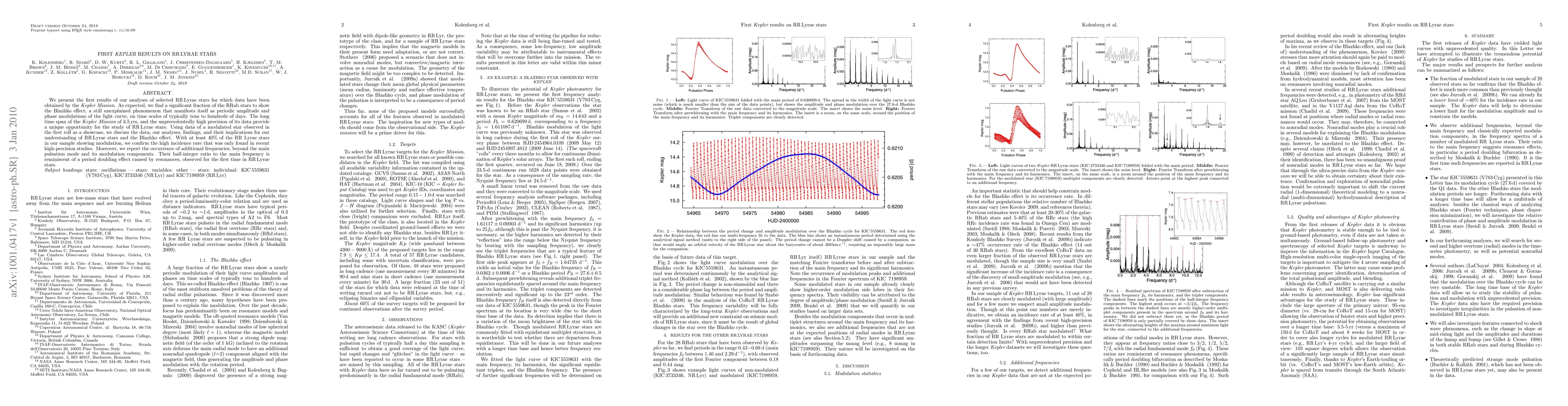 This paper reports on the first Kepler Mission results for RR Lyrae stars, revealing a significant fraction exhibiting the Blazhko effect, with at least 40% of the sample showing modulation. The study also identifies additional frequencies beyond the main pulsation mode, suggesting resonances and period doubling effects in these stars.