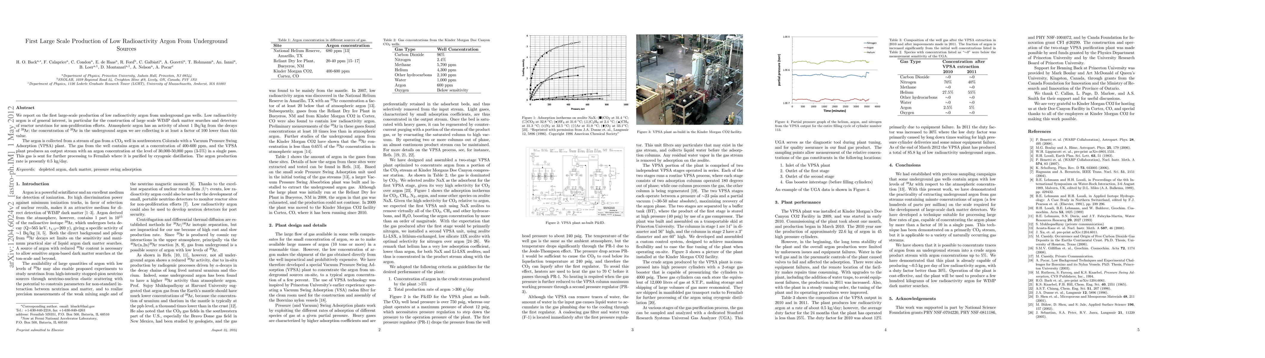We report on the first large-scale production of low radioactivity argon from underground gas wells. Low radioactivity argon is of general interest, in particular for the construction of large scale WIMP dark matter searches and detectors of reactor neutrinos for non-proliferation efforts. Atmospheric argon has an activity of about 1 Bq/kg from the decays of 39Ar; the concentration of 39Ar in the underground argon we are collecting is at least a factor of 100 lower than this value. The argon is collected from a stream of gas from a CO2 well in southwestern Colorado with a Vacuum Pressure Swing Adsorption (VPSA) plant. The gas from the well contains argon at a concentration of 400-600 ppm, and the VPSA plant produces an output stream with an argon concentration at the level of 30,000-50,000 ppm (3-5%) in a single pass. This gas is sent for further processing to Fermilab where it is purified by cryogenic distillation. The argon production rate is presently 0.5 kg/day.