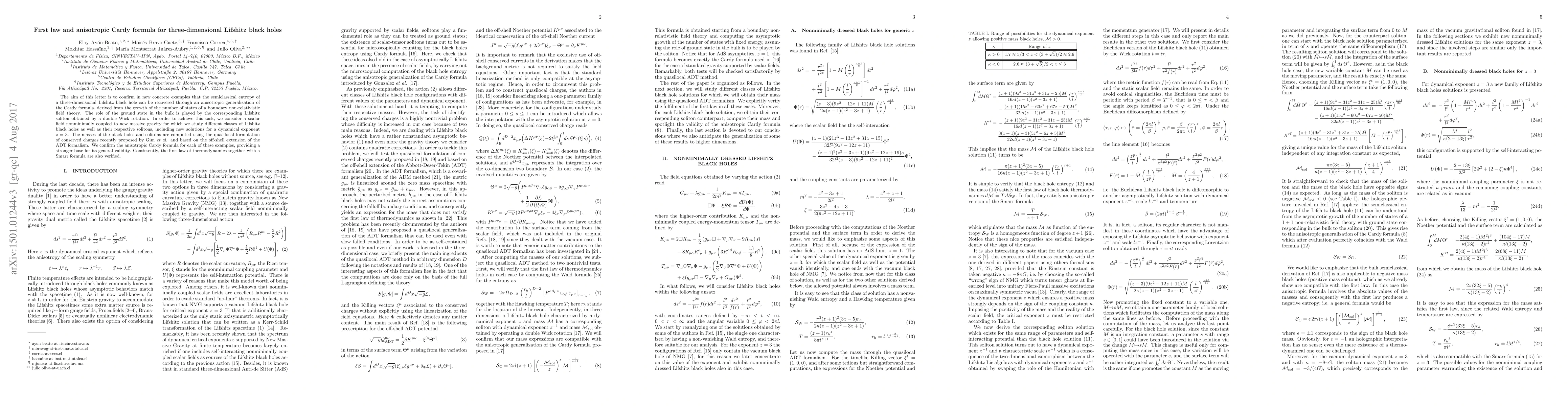 This paper confirms the semiclassical entropy of three-dimensional Lifshitz black holes via an anisotropic Cardy formula derived from non-relativistic field theory. It verifies the formula's validity across various Lifshitz black hole classes and solitons, including new solutions for z=3, and confirms the first law of thermodynamics and a Smarr formula.