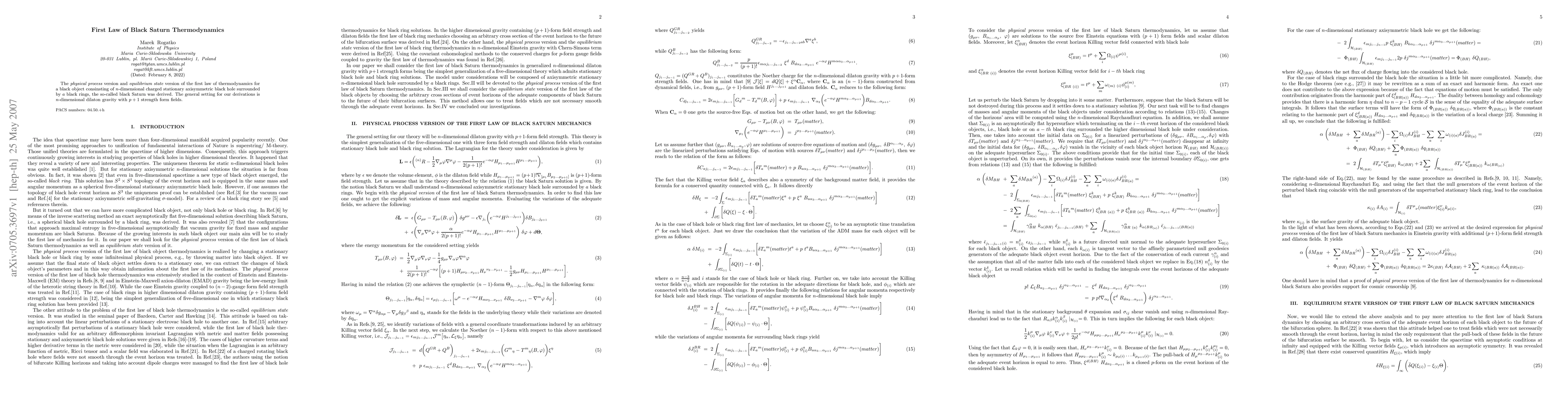 The physical version and equilibrium state version of the first law of thermodynamics for a black object consisting of n-dimensional charged stationary axisymmetric black hole surrounded by $a$ black rings, the so-called black Saturn was derived. The general setting for our derivation is n-dimensional dilaton gravity with p + 1 strength form fields.
