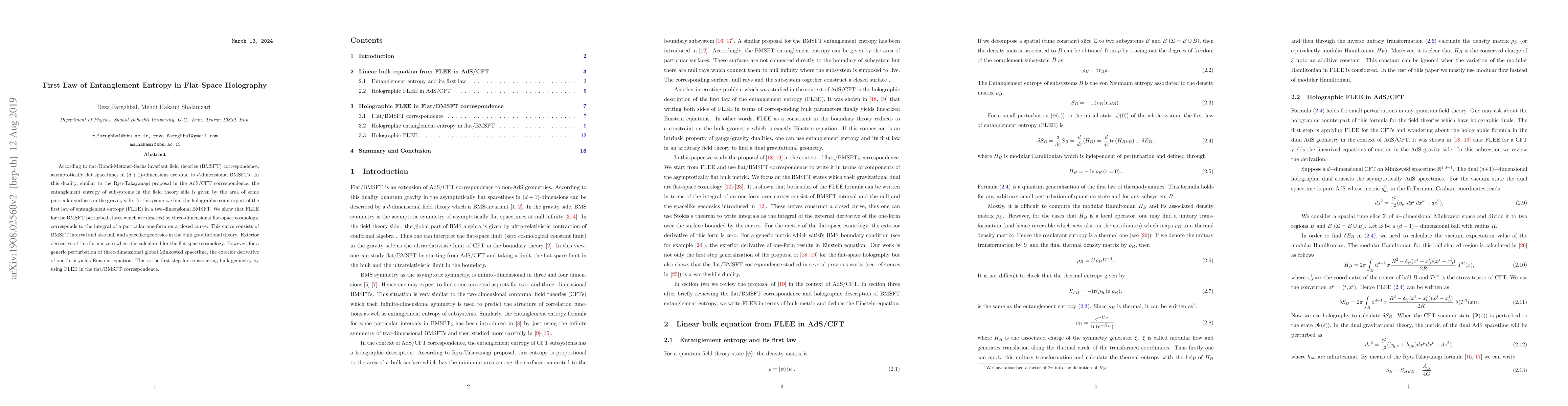The paper presents a detailed derivation of the holographic FLEE in a two-dimensional BMSFT, demonstrating its connection to the exterior derivative of a one-form on a closed curve in the bulk, and showing how this relates to Einstein's equations for generic perturbations.