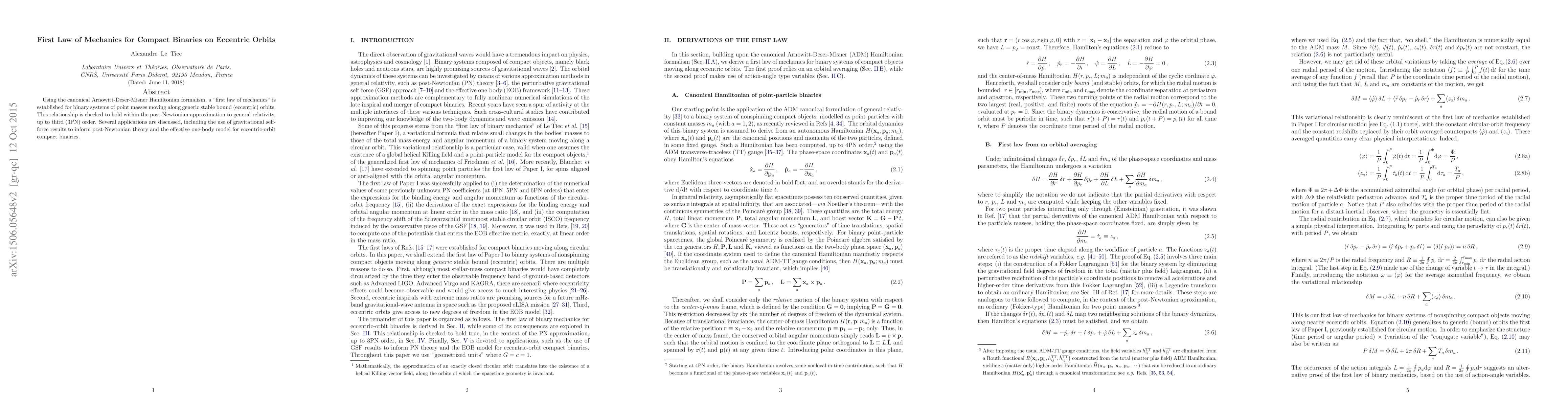 Researchers establish a 'first law of mechanics' for binary systems on eccentric orbits using general relativity's Hamiltonian formalism, with implications for post-Newtonian theory and the effective one-body model.
