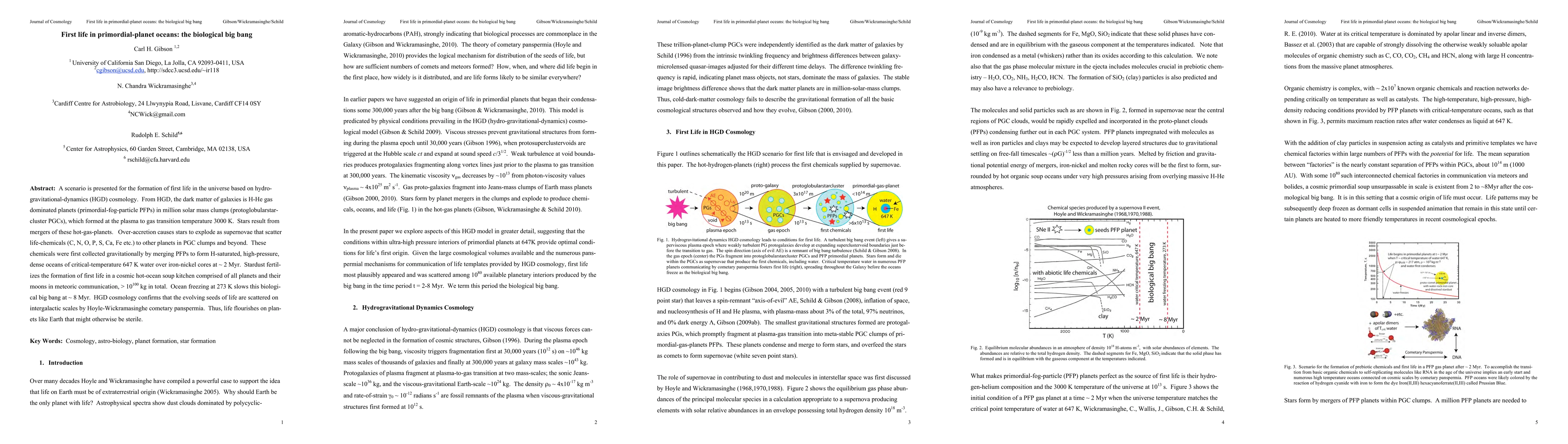 A scenario is presented for the formation of first life in the universe based on hydro-gravitational-dynamics (HGD) cosmology. From HGD, the dark matter of galaxies is H-He gas dominated planets (primordial-fog-particle PFPs) in million solar mass clumps (protoglobularstarcluster PGCs), which formed at the plasma to gas transition temperature 3000 K. Stars result from mergers of the hot-gas-planets. Over-accretion causes stars to explode as supernovae that scatter life-chemicals (C, N, O, P, S, Ca, Fe etc.) to other planets in PGC clumps and beyond. These chemicals were first collected gravitationally by merging PFPs to form H-saturated, high-pressure, dense oceans of critical-temperature 647 K water over iron-nickel cores at ~ 2 Myr. Stardust fertilizes the formation of first life in a cosmic hot-ocean soup kitchen comprised of all planets and their moons in meteoric communication, > 10^100 kg in total. Ocean freezing slows this biological big bang at ~ 8 Myr. HGD cosmology confirms that the evolving seeds of life are scattered on intergalactic scales by Hoyle-Wickramasinghe cometary panspermia. Thus, life flourishes on planets like Earth that would otherwise be sterile.