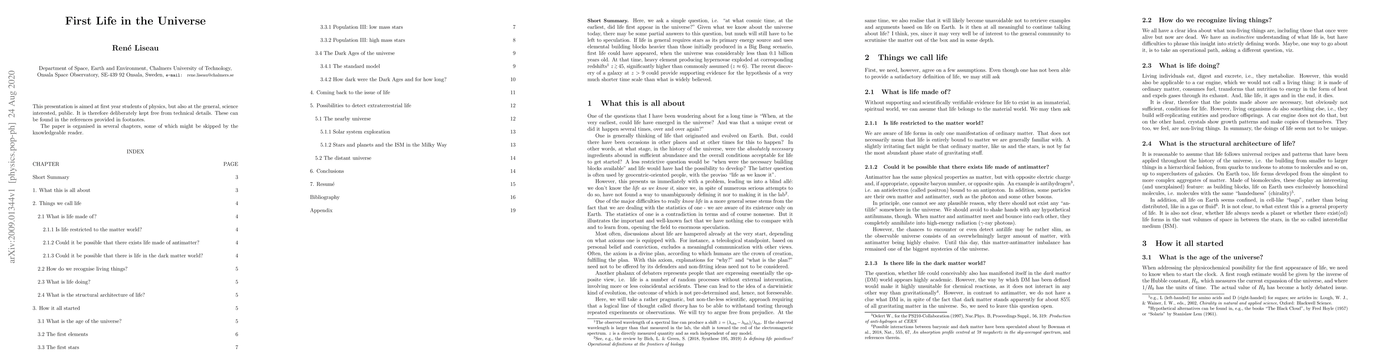 Here, we ask a simple question, i.e. "at what cosmic time, at the earliest, did life first appear in the universe?" Given what we know about the universe today, there may be some partial answers to this question, but much will still have to be left to speculation. If life in general requires stars as its primary energy source and uses elemental building blocks heavier than those initially produced in a Big Bang scenario, first life could have appeared, when the universe was considerably less than 0.1 billion years old. At that time, heavy element producing hypernovae exploded at corresponding redshifts.} $z$\,\gapprox\,45, significantly higher than commonly assumed ($z \approx 6$). The recent discovery of a galaxy at $z > 9$ could provide supporting evidence for the hypothesis of a very much shorter time scale than what is widely believed.