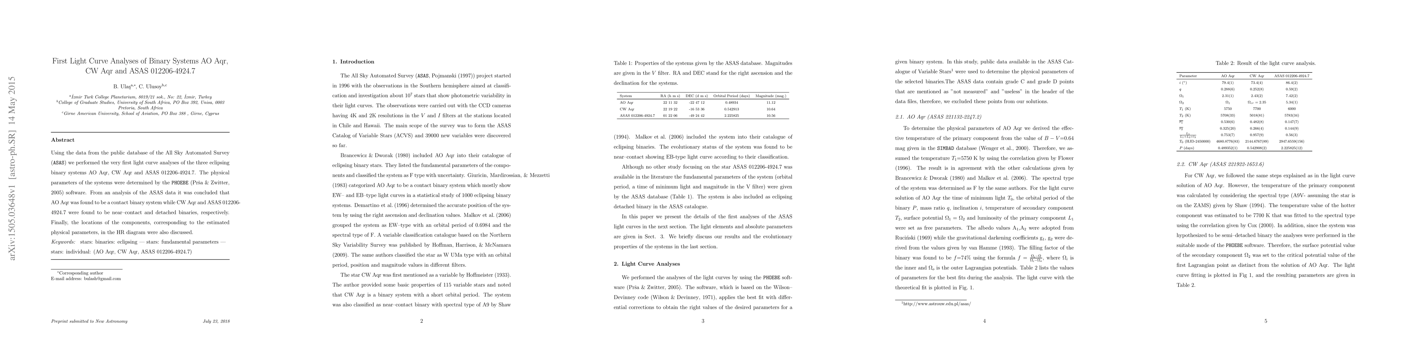 Using the data from the public database of the All Sky Automated Survey ({\tt ASAS}) we performed the very first light curve analyses of the three eclipsing binary systems \astrobj{AO~Aqr}, \astrobj{CW~Aqr} and \astrobj{ASAS~012206-4924.7}. The physical parameters of the systems were determined by the {\tt PHOEBE} software. From an analysis of the ASAS data it was concluded that AO~Aqr was found to be a contact binary system while CW~Aqr and ASAS~012206-4924.7 were found to be near--contact and detached binaries, respectively. Finally, the locations of the components, corresponding to the estimated physical parameters, in the HR diagram were also discussed.