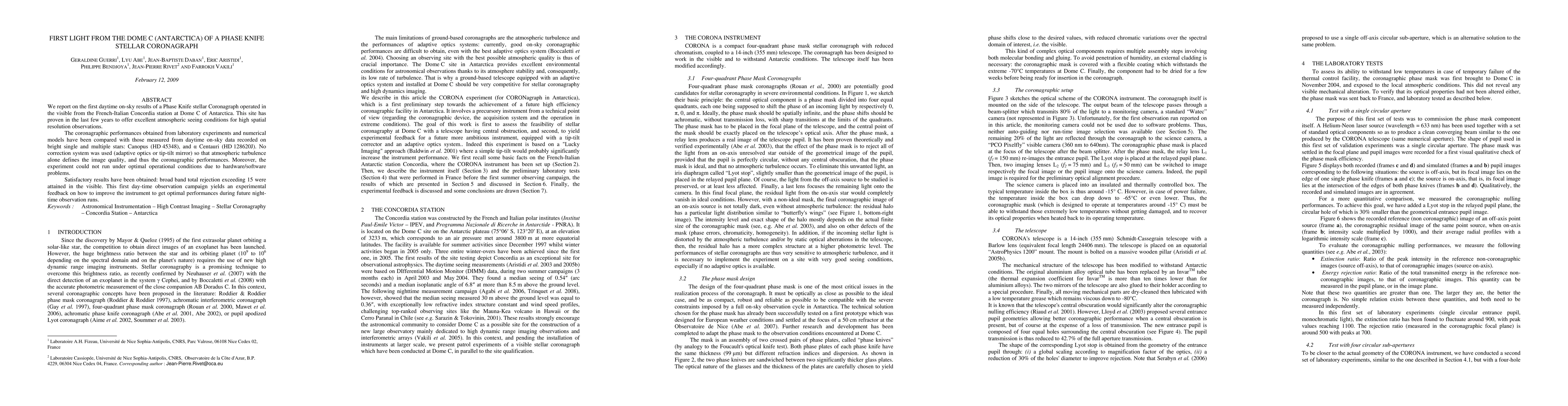 We report on the first daytime on-sky results of a Phase Knife stellar Coronagraph operated in the visible from the French-Italian Concordia station at Dome C of Antarctica. This site has proven in the last few years to offer excellent atmospheric seeing conditions for high spatial resolution observations. The coronagraphic performances obtained from laboratory experiments and numerical models have been compared with those measured from daytime on-sky data recorded on bright single and multiple stars: Canopus (HD 45348), and alpha Centauri (HD 128620J). No correction system was used (adaptive optics or tip-tilt mirror) so that atmospheric turbulence alone defines the image quality, and thus the coronagraphic performances. Moreover, the experiment could not run under optimal operational conditions due to hardware/software problems. Satisfactory results have been obtained: broad band total rejection exceeding 15 were attained in the visible. This first day-time observation campaign yields an experimental feedback on how to improve the instrument to get optimal performances during future night-time observation runs.