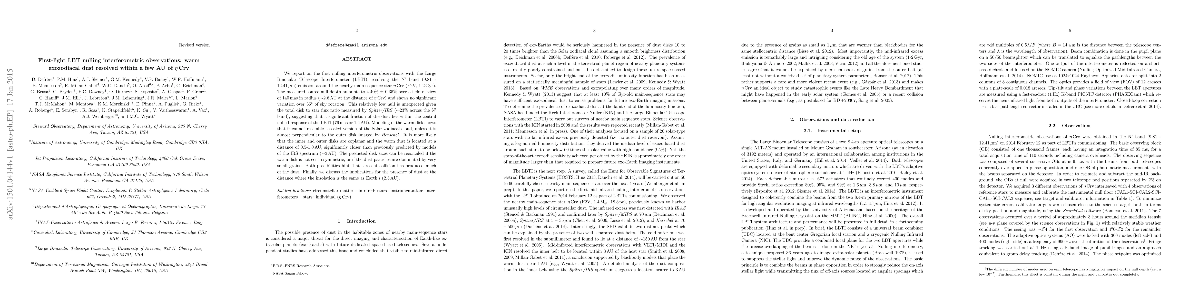 We report on the first nulling interferometric observations with the Large Binocular Telescope Interferometer (LBTI), resolving the N' band (9.81 - 12.41 um) emission around the nearby main-sequence star eta Crv (F2V, 1-2 Gyr). The measured source null depth amounts to 4.40% +/- 0.35% over a field-of-view of 140 mas in radius (~2.6\,AU at the distance of eta Corvi) and shows no significant variation over 35{\deg} of sky rotation. This relatively low null is unexpected given the total disk to star flux ratio measured by Spitzer/IRS (~23% across the N' band), suggesting that a significant fraction of the dust lies within the central nulled response of the LBTI (79 mas or 1.4 AU). Modeling of the warm disk shows that it cannot resemble a scaled version of the Solar zodiacal cloud, unless it is almost perpendicular to the outer disk imaged by Herschel. It is more likely that the inner and outer disks are coplanar and the warm dust is located at a distance of 0.5-1.0 AU, significantly closer than previously predicted by models of the IRS spectrum (~3 AU). The predicted disk sizes can be reconciled if the warm disk is not centrosymmetric, or if the dust particles are dominated by very small grains. Both possibilities hint that a recent collision has produced much of the dust. Finally, we discuss the implications for the presence of dust at the distance where the insolation is the same as Earth's (2.3 AU).