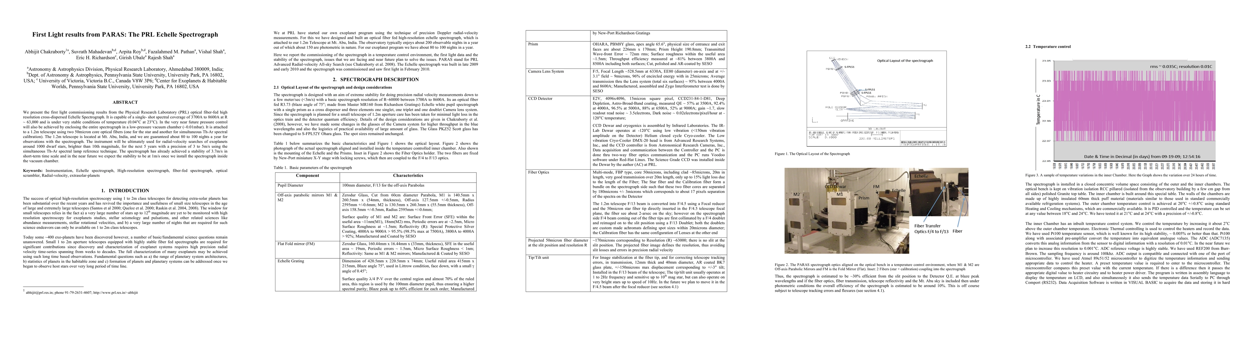 The first light results from the PRL Echelle Spectrograph show its capability for high-resolution spectroscopy over 3700A to 8600A at R ~ 63,000, with future plans for pressure stabilization in a vacuum chamber. The instrument will be used for precise radial-velocity searches of exoplanets around 1000 dwarf stars.